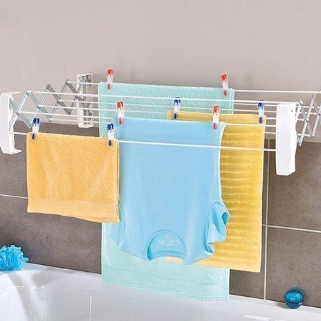 Los tendederos con fijación son los más habituales en el exterior, ya que se cuelgan, principalmente, en las paredes. Dentro de este tipo de tendederos, puedes encontrar de diferentes medidas y materiales: