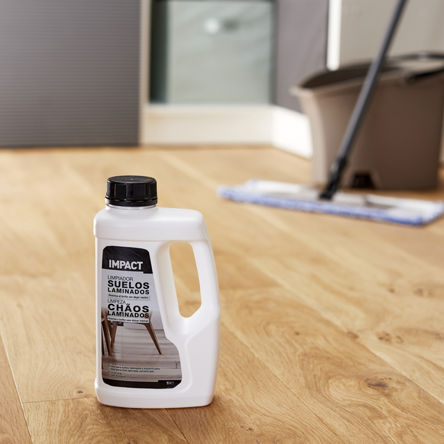 • Productos de limpieza específicos. Es recomendable que uses productos de limpieza fabricados expresamente para la limpieza del suelo laminado. Usa la dosis mínima recomendada por el fabricante y usa una mopa o fregona bien escurrida para facilitar la limpieza. Deja secar sin aclarar. Evita los productos con químicos o abrasivos, ya que con el tiempo llegan a corroer el suelo laminado.