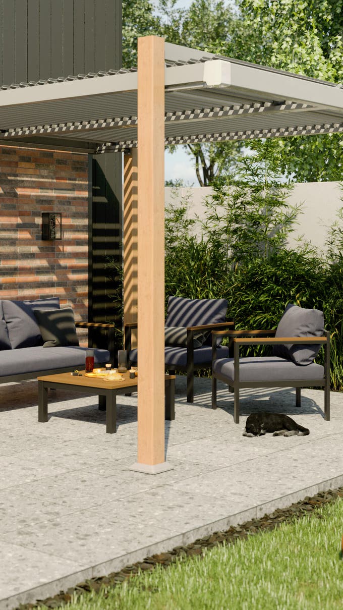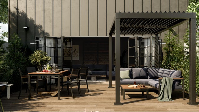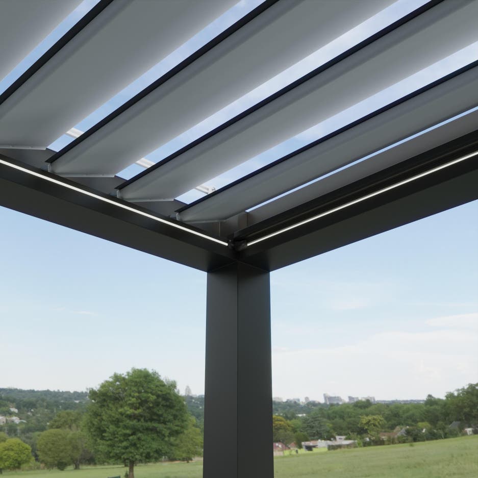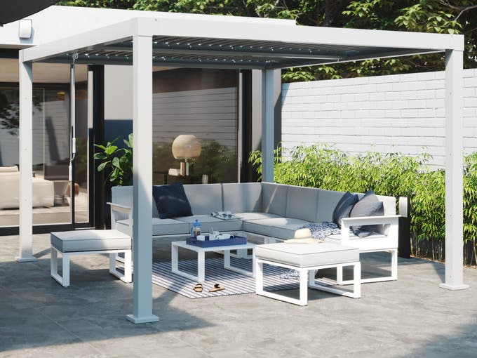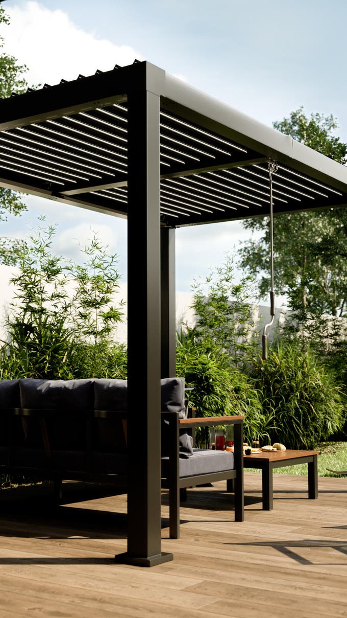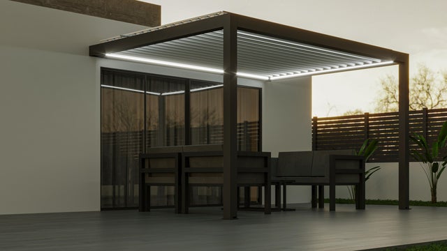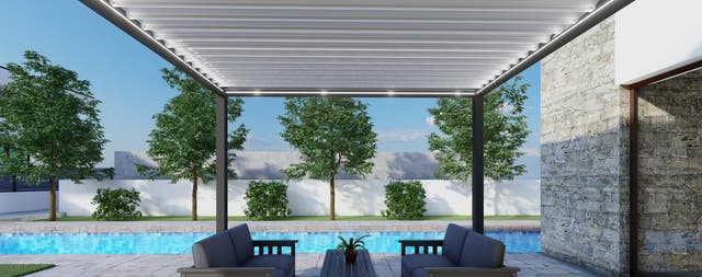 • Protección contra el sol: las lamas motorizadas y orientables del techo hacen posible la regulación de la entrada de la luz, de manera que la temperatura bajo la pérgola sea la idónea y no tengas que preocuparte por los rayos del sol.