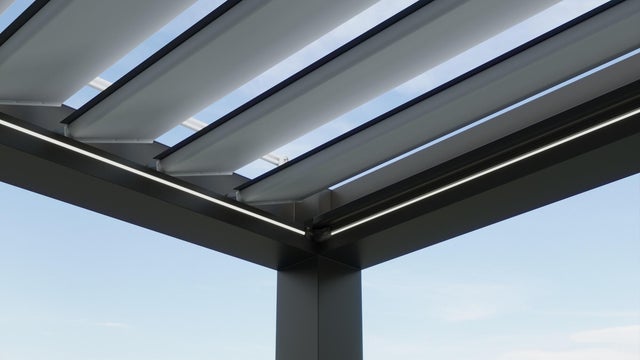 Hay modelos que cuentan con iluminación LED, ofreciendo la posibilidad de crear atmósferas perfectas para disfrutar del espacio a cualquier hora del día y sin importar el tiempo que haga. Las luces LED rodean todo el perímetro de la pérgola.