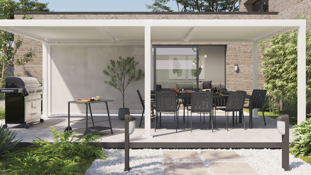 Con una pérgola bioclimática podrás controlar la temperatura, sea como sea el clima. La posibilidad de voltear las lamas evita el efecto invernadero ya que el aire se renueva constantemente y previene que el calor se acumule.