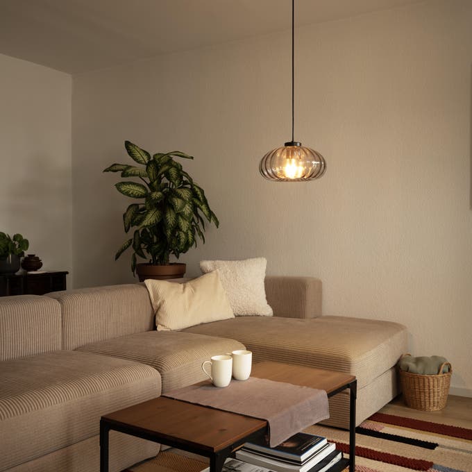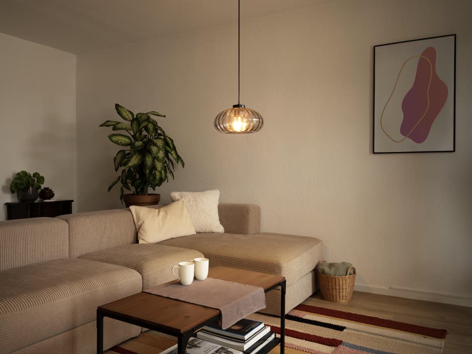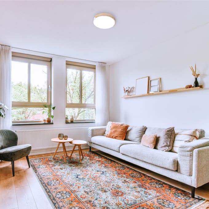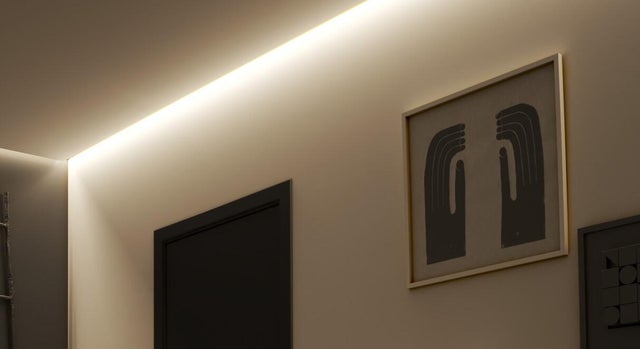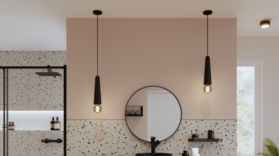 Lo habitual es contar con iluminación ambiental que puedes conseguir con una bombilla LED de luz cálida, colocada en una lámpara de techo o un plafón.