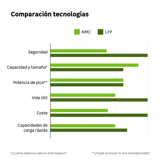 Las baterías NMC ofrecen una mayor densidad energética (ocupan menos espacio), pero quedan atrás en términos de seguridad, durabilidad y sostenibilidad. Y, además, son más caras.