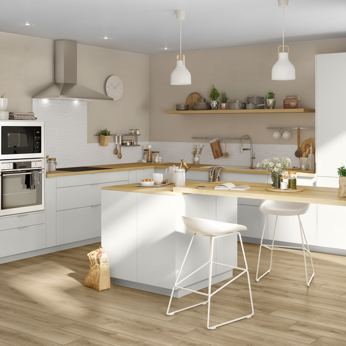 El diseño de una cocina americana debe responder a un equilibrio entre estética y confort. En cuanto a estética, en LEROY MERLIN puedes escoger mobiliario en tonos neutros, el atemporal blanco o acabados madera, también colores de moda, que combinados con piedras en la encimera y antepecho o revestimiento de la isla, dará como resultado una cocina a tu medida.