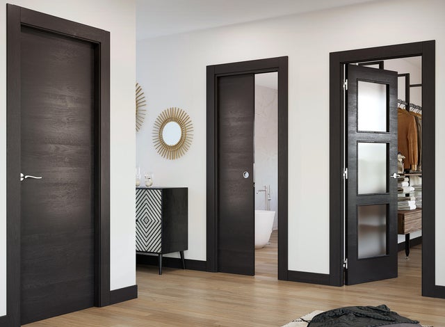 Este diseño lo puedes encontrar en diferentes modelos de puertas que tienen ese acabado azabache. Las series de puertas Oslo, Berna, Chloe, Atelier son las opciones que pone a tu disposición LEROY MERLIN.