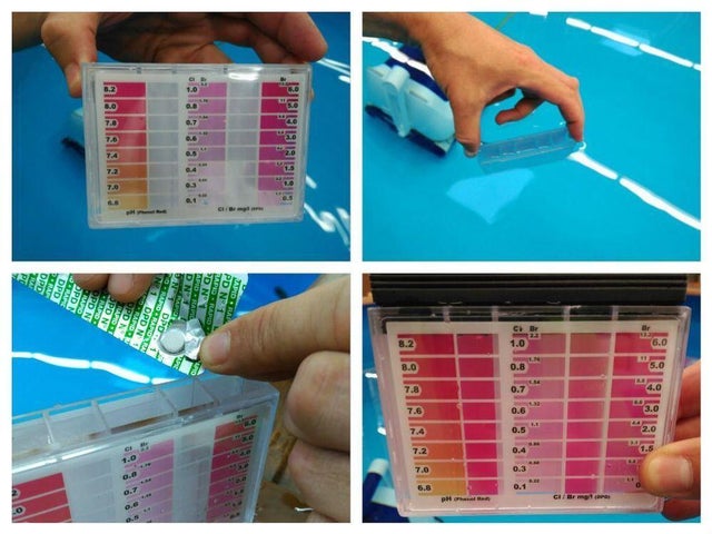 Usar analizadores con reactivo líquido o en pastillas es más sencillo de lo que piensas. Basta con tomar una muestra representativa del vaso de la piscina con la cubeta que viene en el kit y añadir el reactivo indicado para el parámetro que se quiere analizar. Tras unos segundos y después de agitar, el agua se vuelve de un color que debes comparar con la tabla cromática que incorpora el analizador. Así conocerás el valor numérico del parámetro.