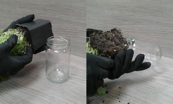 Trasplanta las plantas de la maceta a los tarros de cristal de tu huerto urbano y añade tierra si fuera necesario para que su raíz quede bien cubierta.