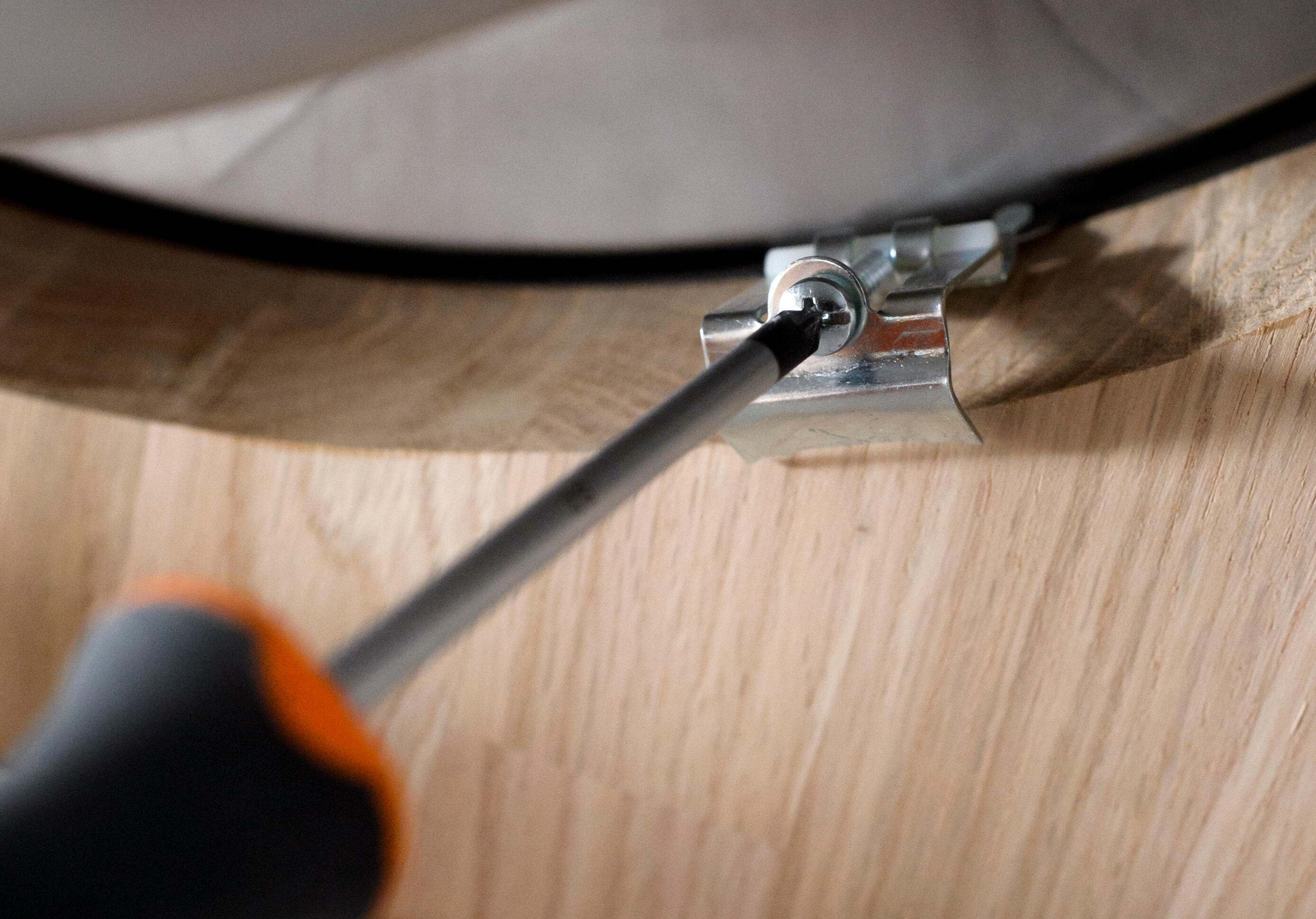 1.3. Para poner fregadero bajo encimera, comprueba que no hay huecos visibles y que la base del fregadero apoya en todas las partes por igual. Coloca y aprieta las grapas de sujeción con el destornillador.