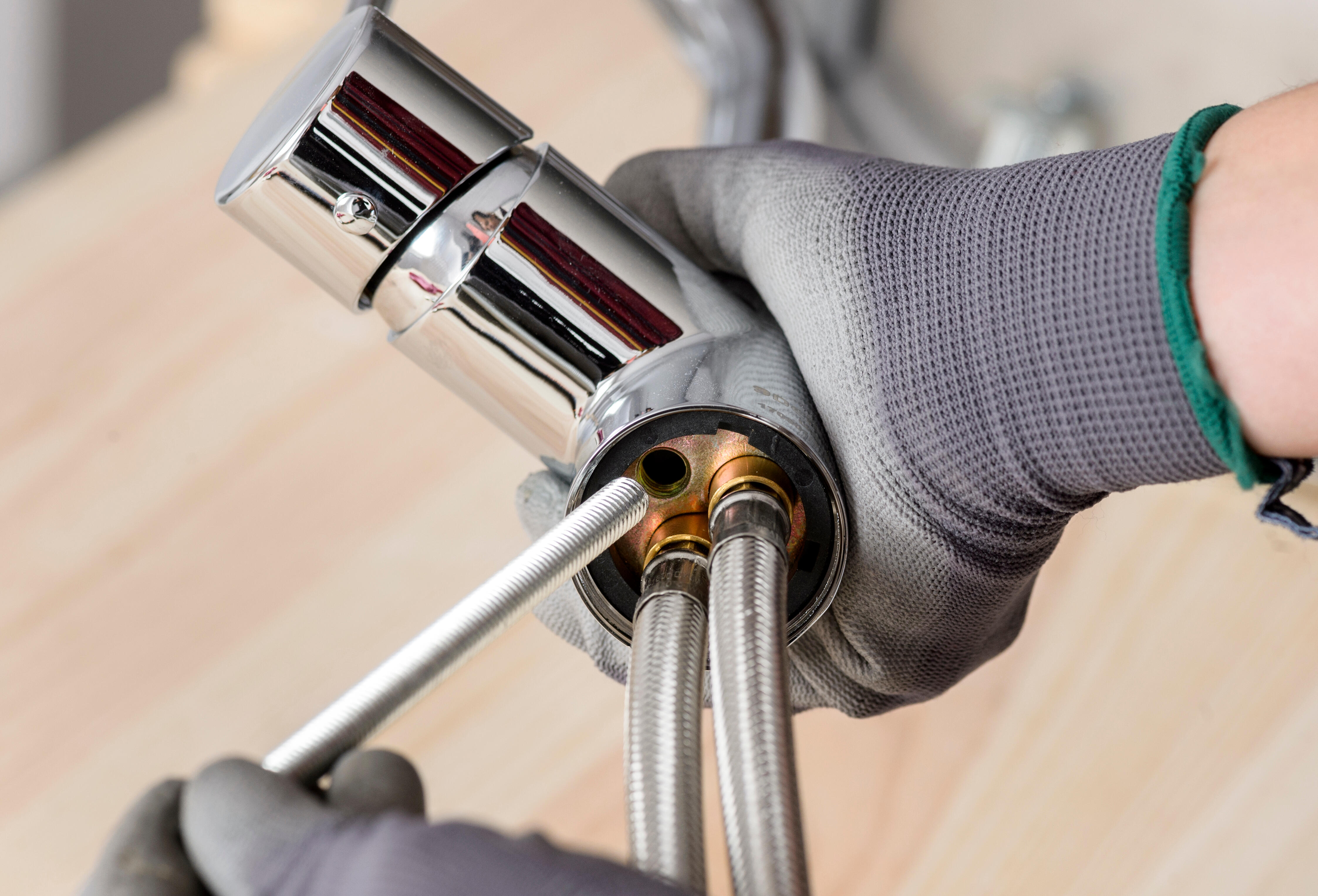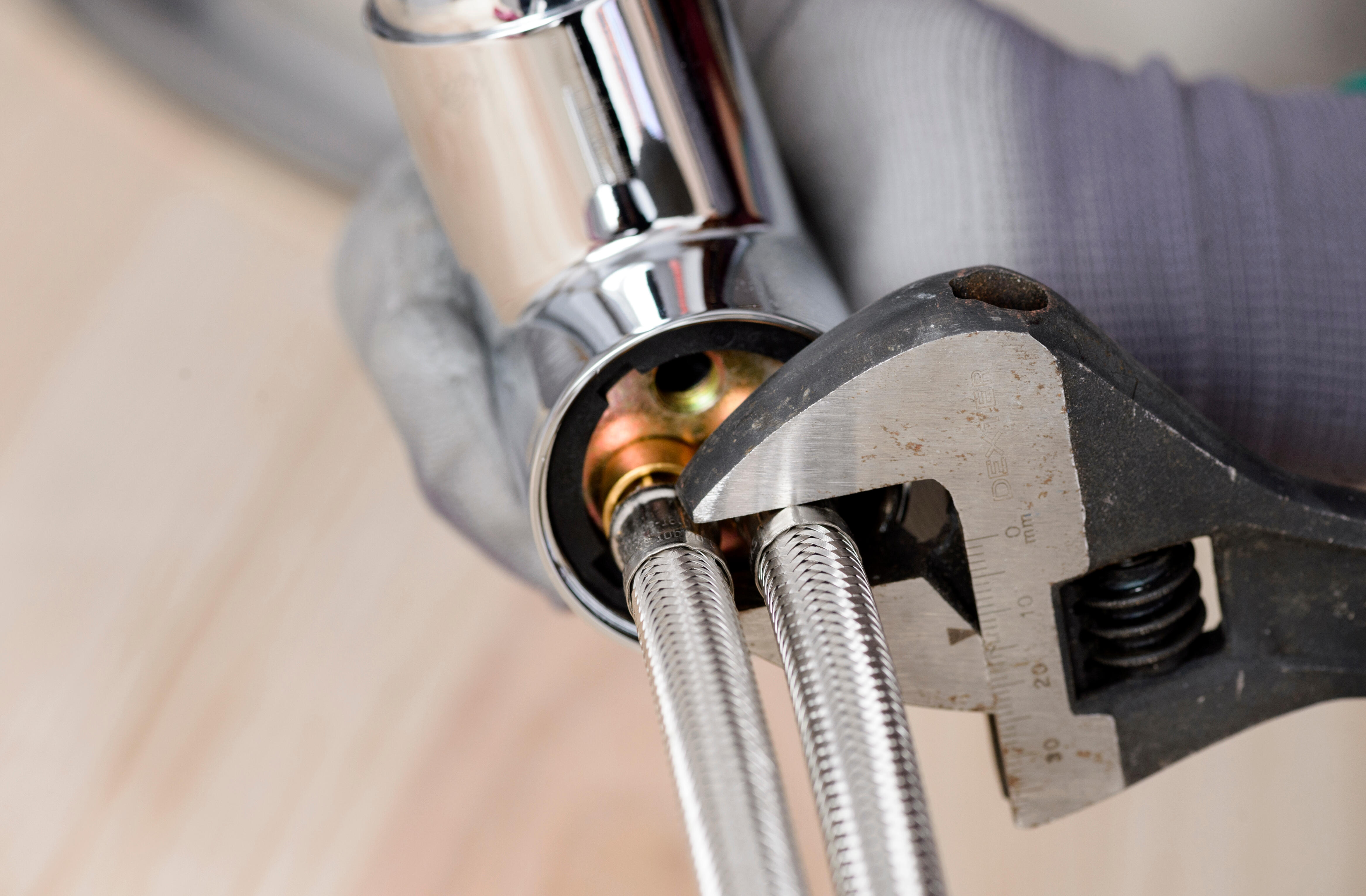 3.1. Enrosca los latiguillos para el agua fría y el agua caliente en la base del grifo. Hazlo con la mano y después de manera ligera con una llave fija o una inglesa pequeña. No hace falta colocar juntas, incluidas en el dispositivo.