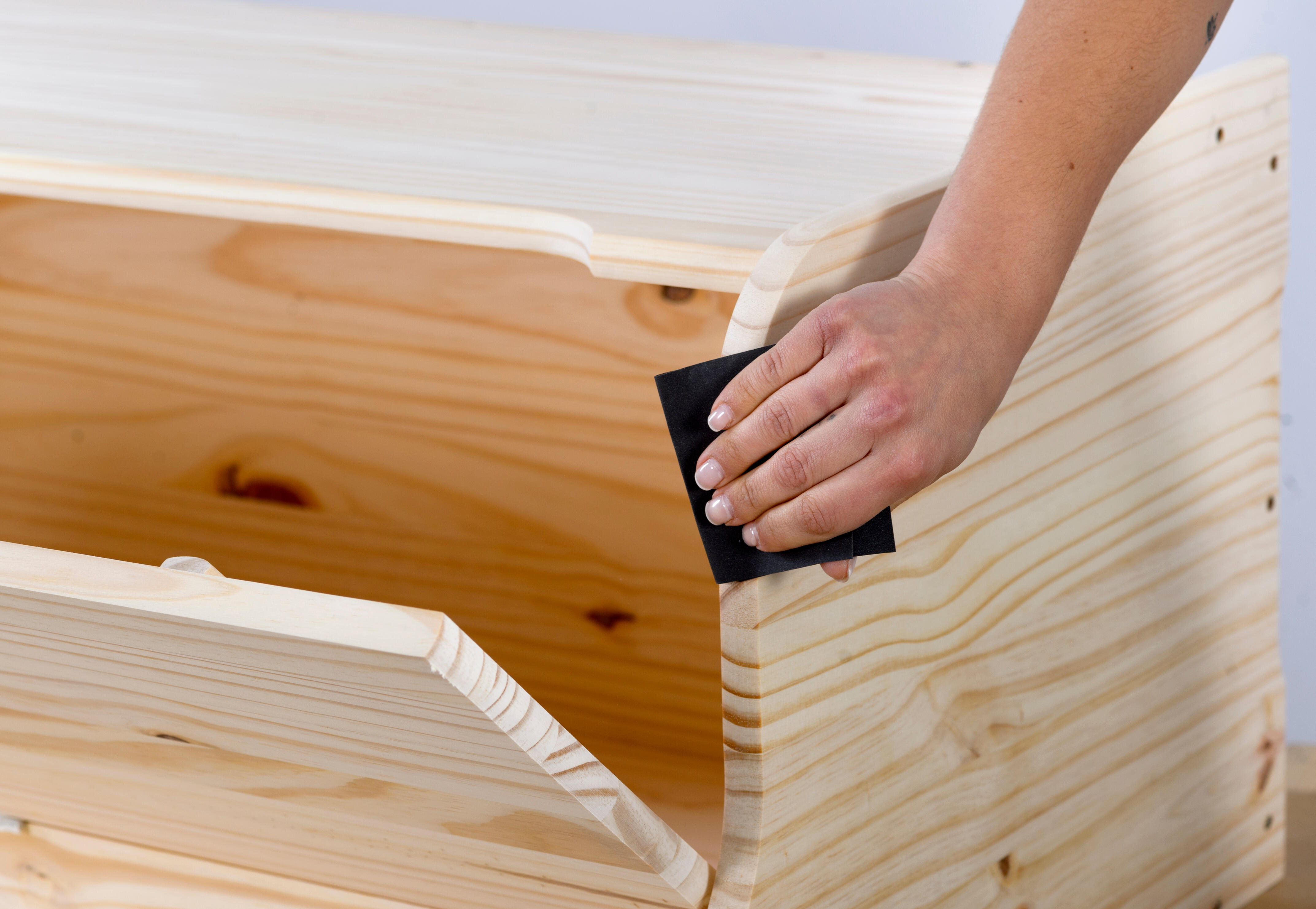 1.2. En madera nueva es conveniente siempre dar un lijado, para dejar una superficie fina. Después debes limpiar con trapo húmedo y secar. Si la superficie de un mueble viejo no estuviera en buen estado de acabado, lija de manera suave para mejorar la adherencia.