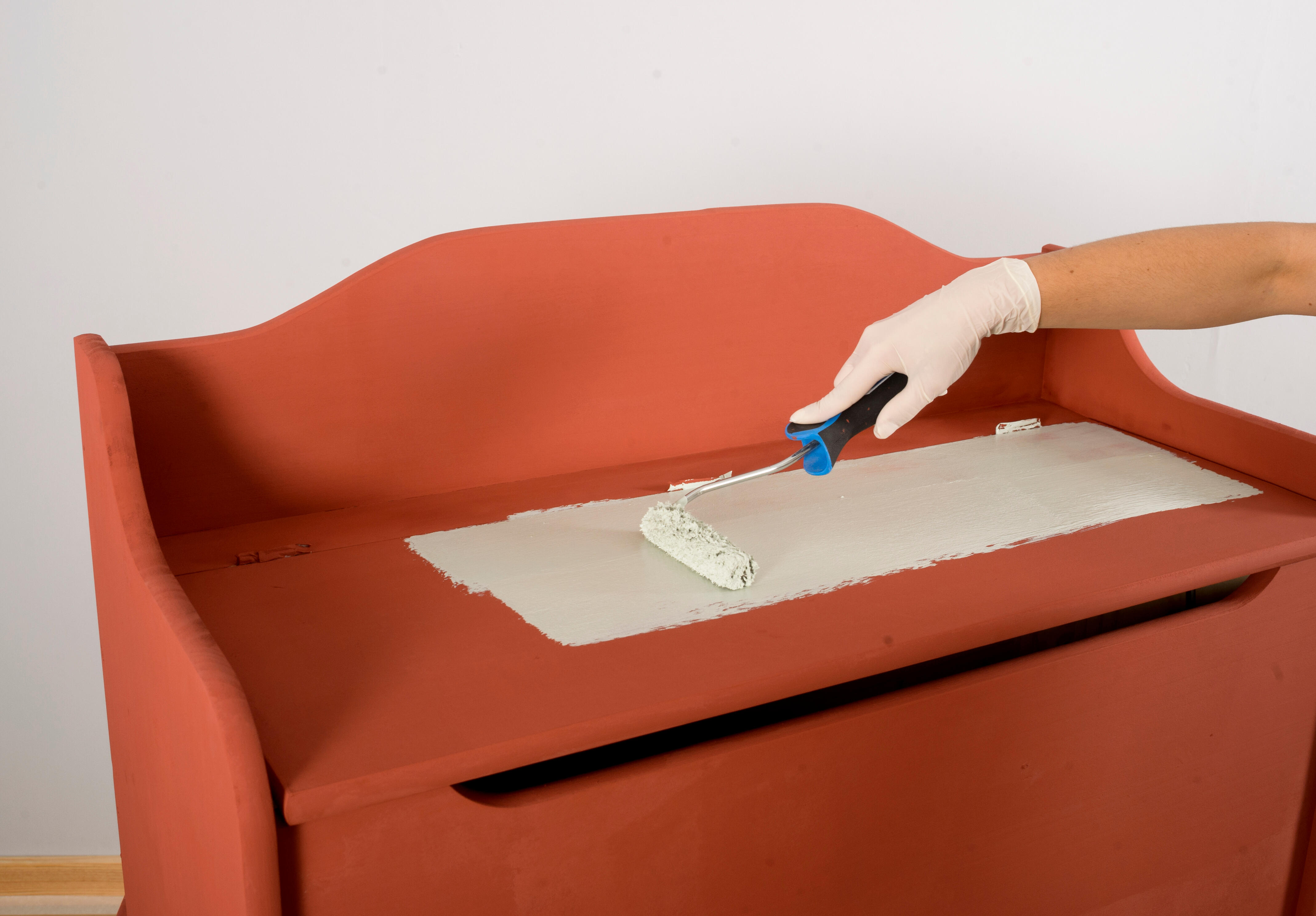 2.3. Dependiendo de los acabados del mueble, en superficies más lisas, puedes usar también un rodillo de lana con pelo corto. Sigue igualmente la veta de la madera.