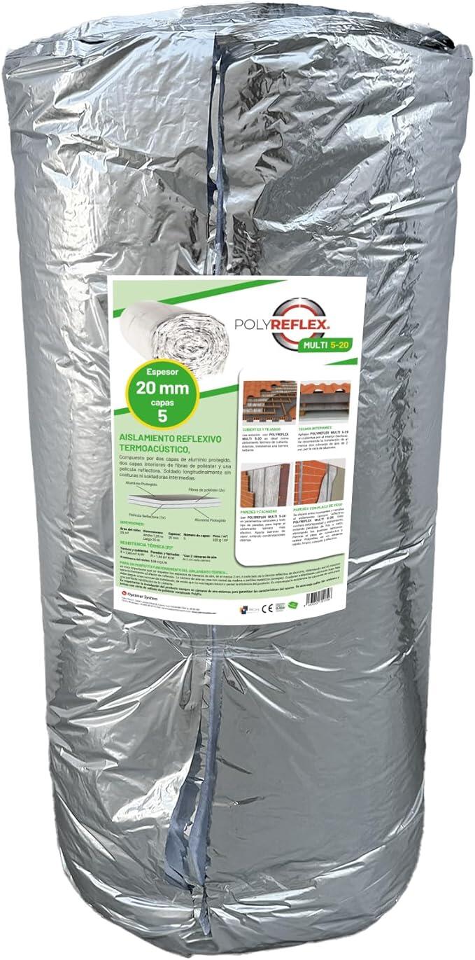 Rollo Aislante térmico reflexivo. Aislamiento reflexivo termoacústico, compuesto por dos capas de aluminio protegido, dos capas interiores de fibras de poliéster y una película reflectora.