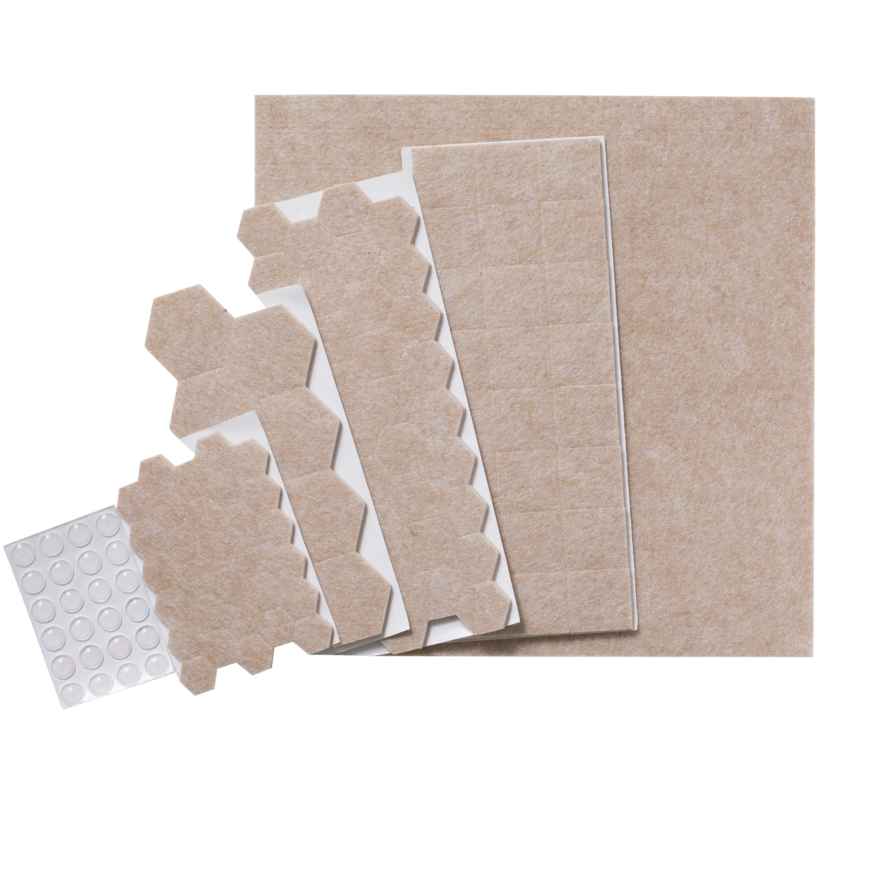 Pack de 123 fieltros combinados Standers fabricados en fieltro de color beige con forma redonda y cuadrada y acabado en bruto. Indicado para proteger el piso, está destinado para todo tipo de muebles, siendo compatible con superficies de piedra, alfombra, PVC o linóleo. Fijación mediante adhesivo. Ofrece 3 años de garantía. Medidas: 4 mm de alto.