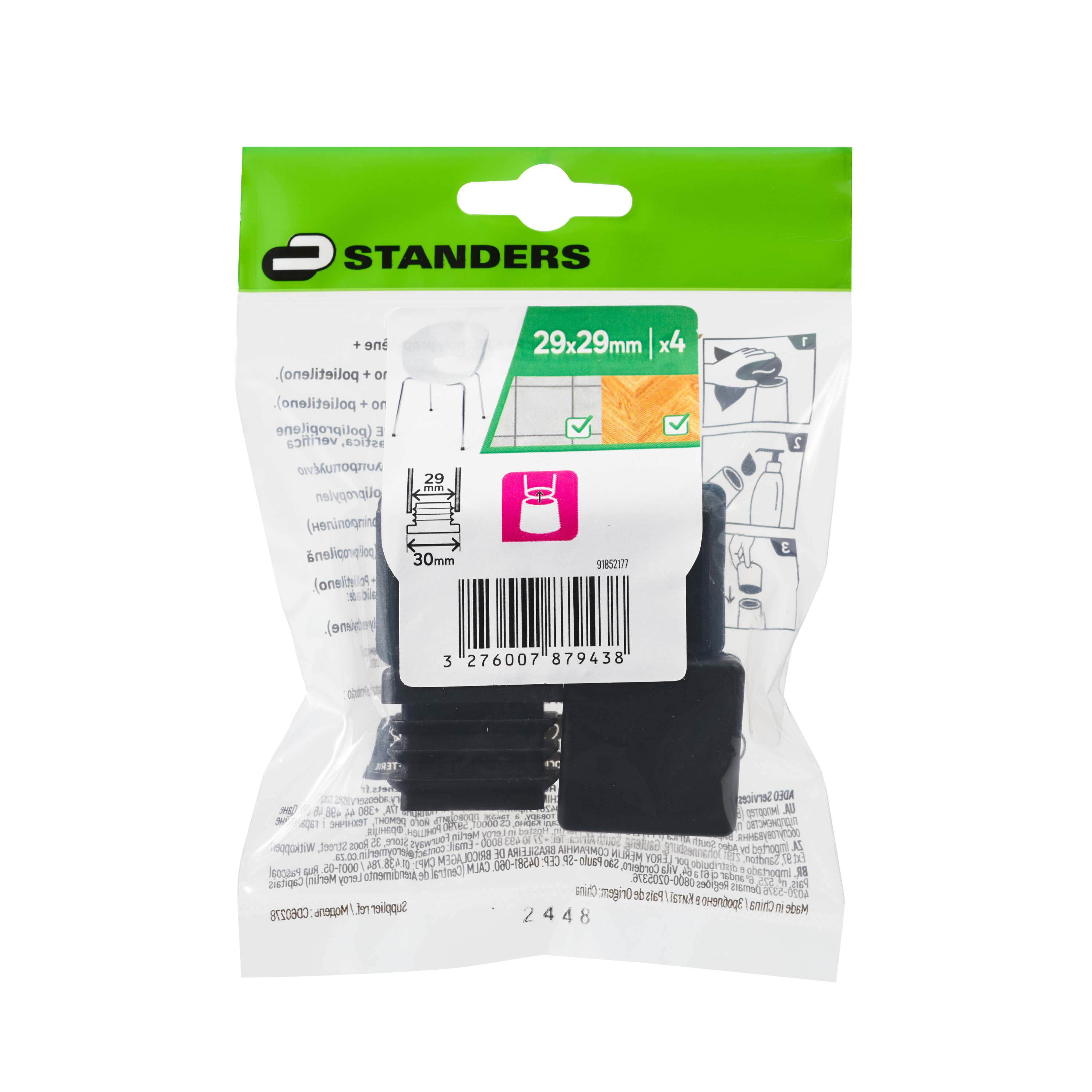 Pack de 4 conteras Standers fabricadas en PVC con acabado de color negro y forma cuadrada. Compatibles con suelos de cerámica y parqué de interior. Ofrece 5 años de garantía. Medidas externas de cada contera: 30 x 30 mm (ancho x largo).