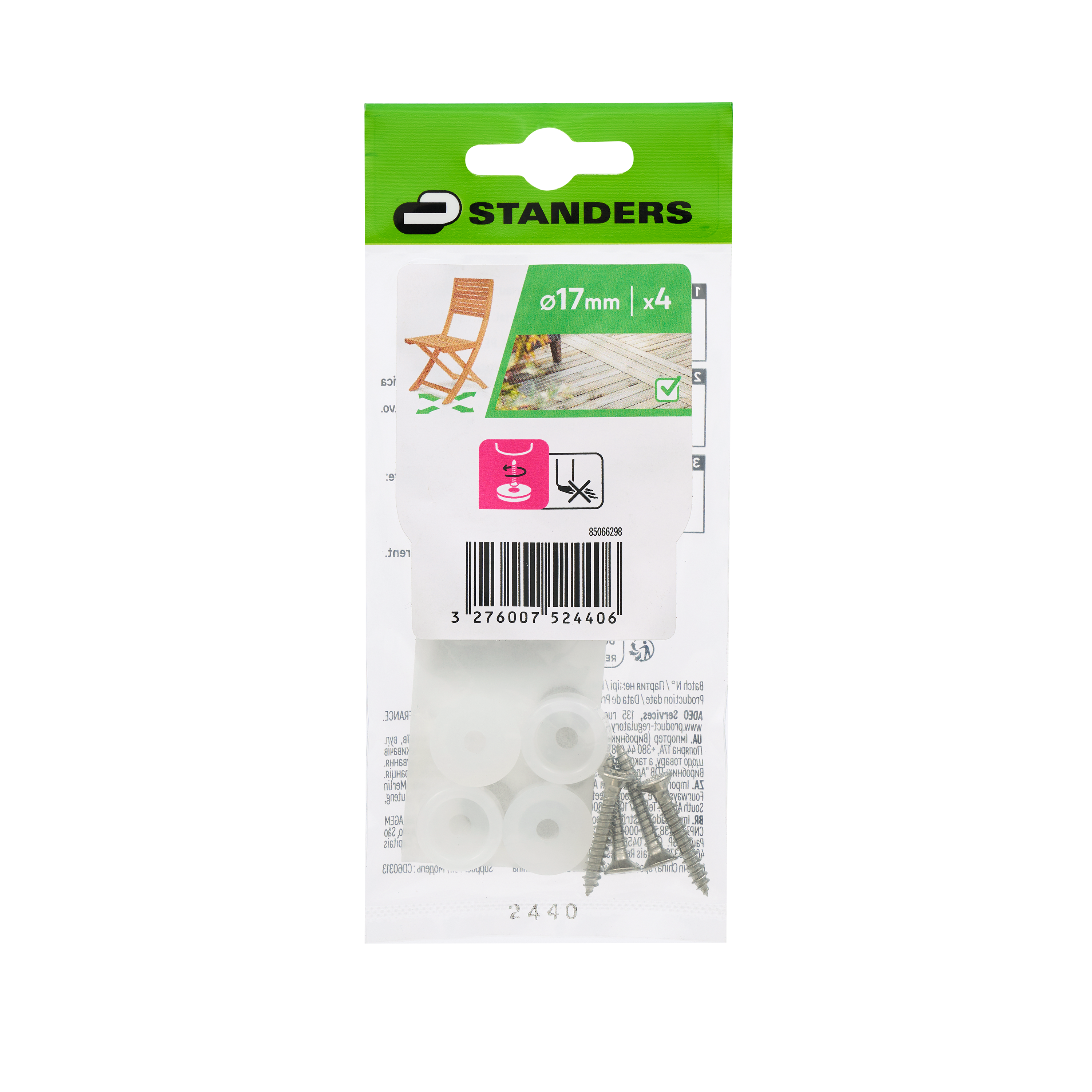 Pack de 4 almohadillas, fieltros y amortiguadores combinados Standers fabricados en goma transparente con forma redonda y acabado en bruto. Indicado para proteger el piso, está destinado para todo tipo de muebles, siendo compatible con cualquier tipo de suelo. Fijación mediante atornillado. Ofrece 3 años de garantía. Medidas: 17 x 7 x 17 mm (ancho x alto x largo).