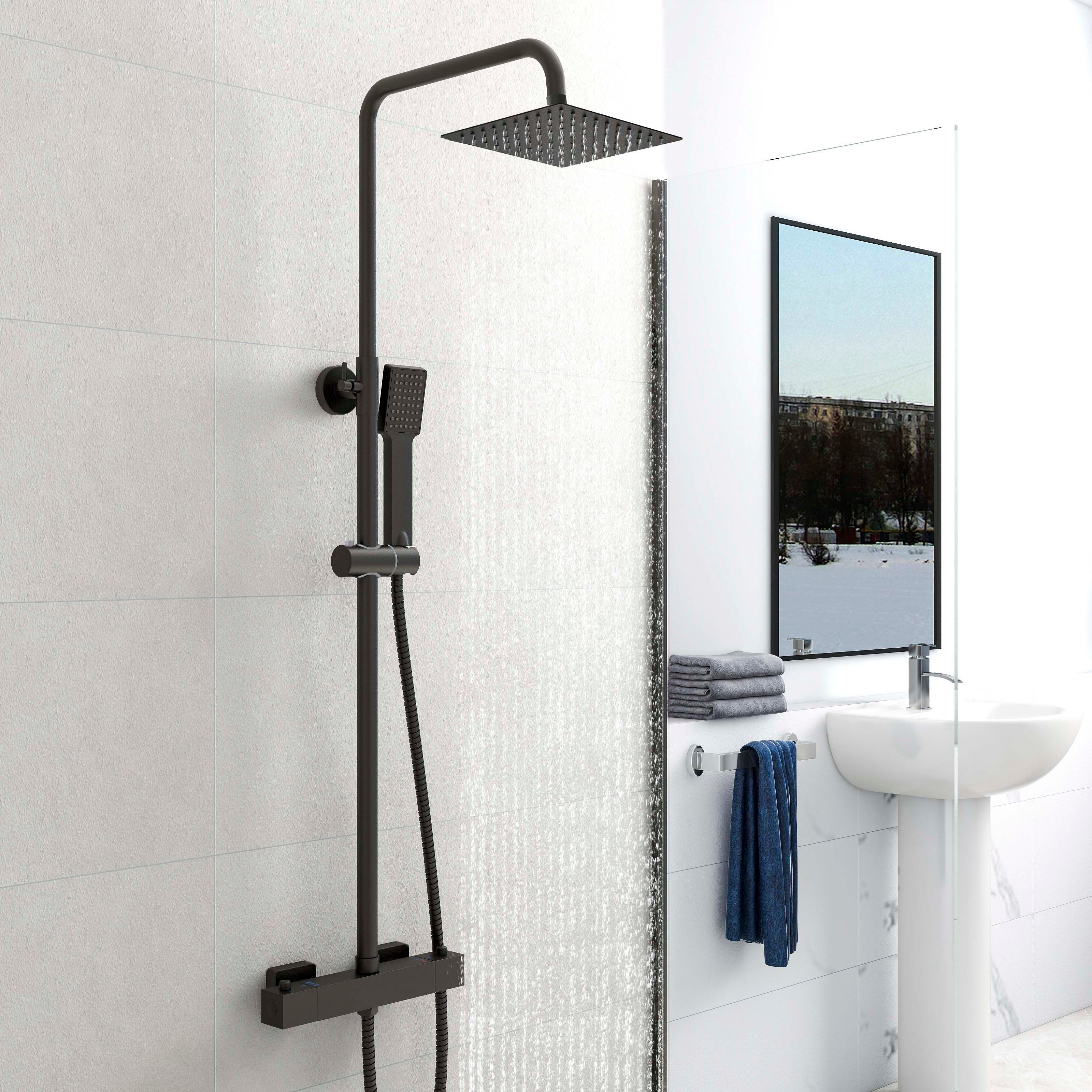 Aica Columna de Ducha Termostática Negro Mate Cuadrada Barra Ajustable Cabezal Duhca Lluvia
