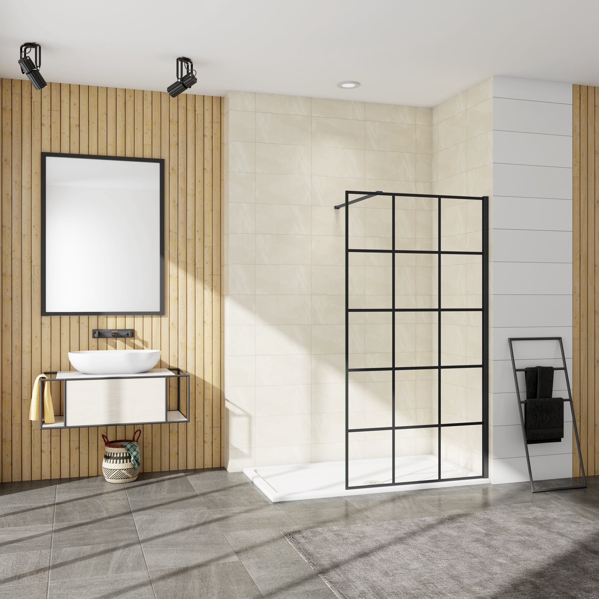 AICA Walkin Mampara Panel de ducha serigrafiada de celosía cuadrada Vidrio Antical 8mm con Barra1 90cm Perfil Negro Mate (88-90)x200cm