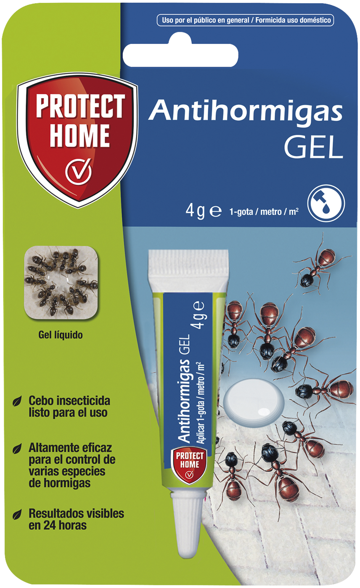 UTILICE LOS BIOCIDAS DE FORMA SEGURA. LEA SIEMPRE LA ETIQUETA Y LA INFORMACIÓN SOBRE EL BIOCIDA ANTES DE USARLO. Cebo en gel para el control de las principales especies de hormigas. Es altamente atractivo y de rápida acción. Fácil de usar, basta colocar una gota cerca de los lugares de paso de las hormigas. Éstas llevan el cebo al hormiguero, que queda erradicado a los pocos días de la aplicación. Uso en interiores y exteriores. Los cebos son de 4 gramos.