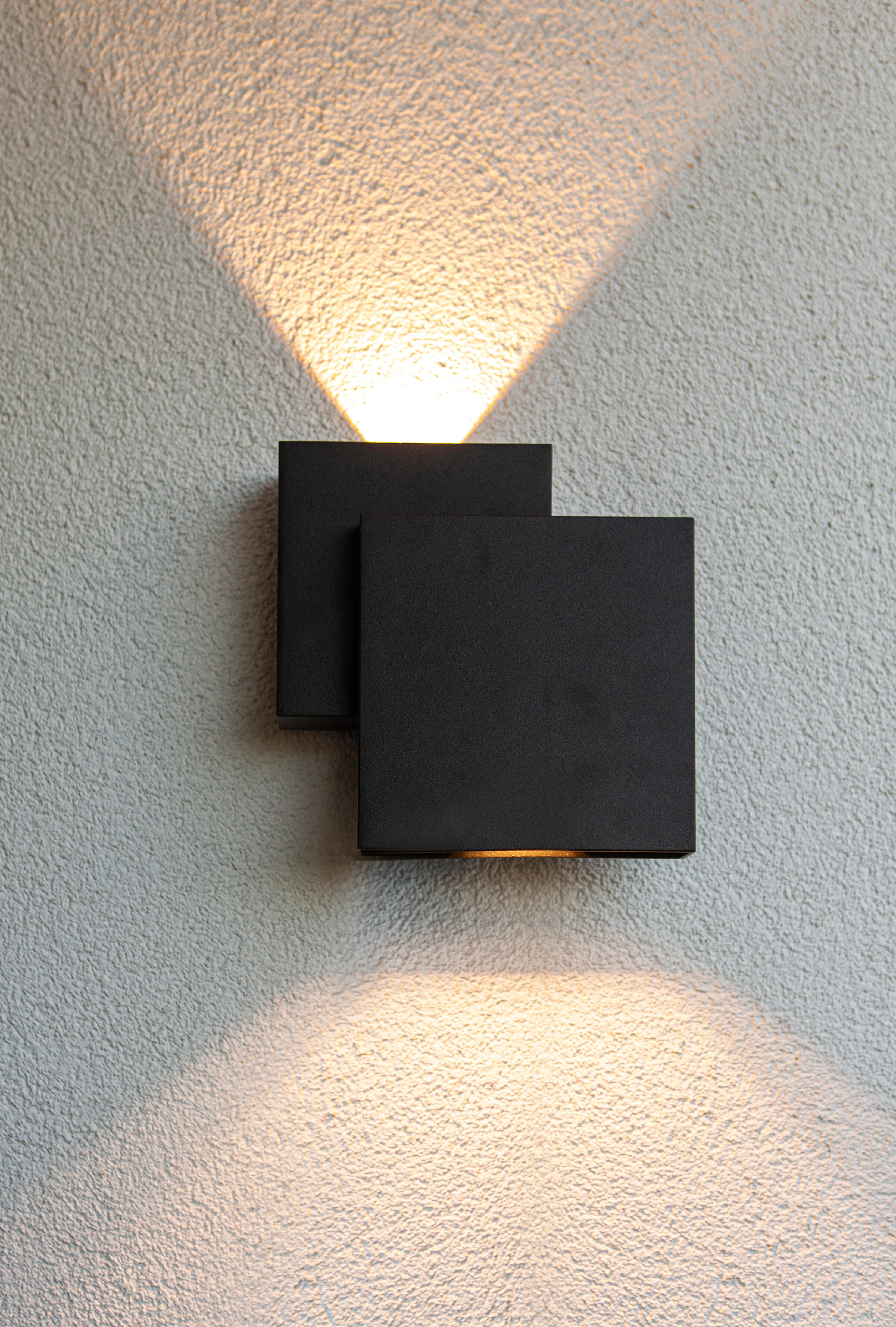 Aplique led de exterior con 2 luces Rialto fabricado en aluminio con acabado en negro mate. Tiene diversos patrones de luz, una potencia de 16 W y emite una luz blanca cálida de 3.000 K y 900 lúmenes de intensidad. Índice de protección: IP44. Garantía de 5 años. Etiqueta energética: D. Medidas: 21 x 21 x 6 cm (ancho x alto x fondo).