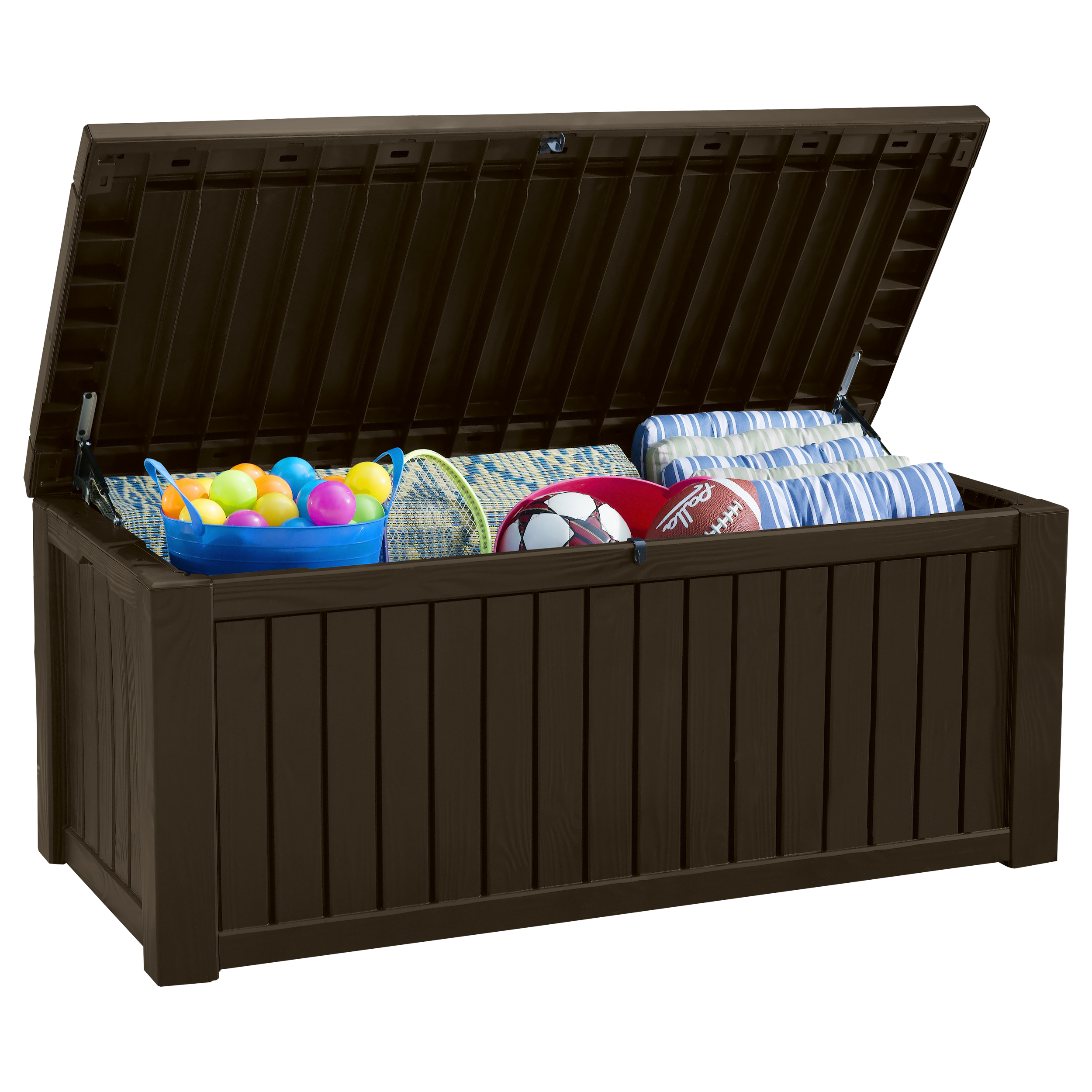 Más información Este enlace se abrirá en una nueva ventanaArcón de jardín fabricado en resina de color marrón oscuro con textura rayada de imitación madera. Cuenta con 570 litros de capacidad y apertura con puerta superior mediante candado. Su sistema hidráulico favorece un correcto uso de almacenamiento e impide que la tapa se deteriore por portazos. Medidas: 155 x 72 cm (alto x ancho).