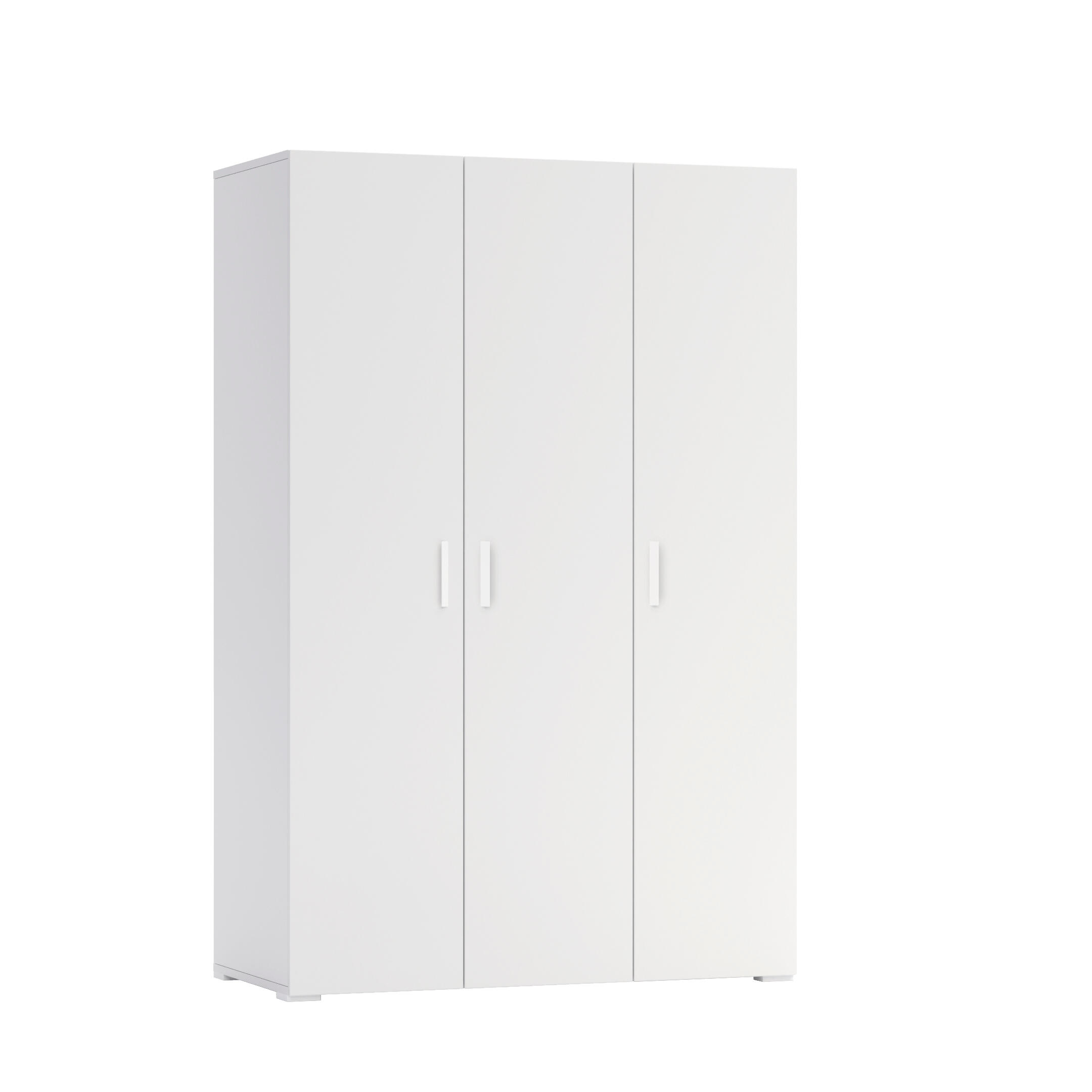 Armario ropero de la Serie ONE. Apertura abatible con 3 puertas. Acabado blanco. Fabricado en aglomerado recubierto de melamina de alta calidad fácil de limpiar. Recomendado para dormitorios y habitaciones secundarias. En su distribución interior incluye una barra de armario y cuatro baldas. Producto en kit listo para montar. Fácil y rápido. Incluye tirador, patas, bisagras y tornillería necesarias para su montaje. Dispone de certificación PEFC que garantiza que la madera utilizada proviene de bosques gestionados de una forma sostenible. Medidas: 191x125x53 cm (altoxanchoxfondo).