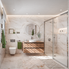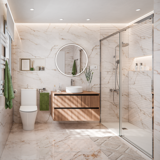 Revestimiento de pasta blanca rectificado con acabado brillante. Mármol de fondo blanco roto con vetas en color jaspe y dorada. Permite construir estancias modernas y atemporales. Medidas: 31,5 x 100 cm (ancho x largo).