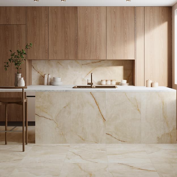 Baldosa porcelánico esmaltado serie Nuvola marca Gayafores. Decorado para base Nuvola Gold. Efecto mármol. Color gold. Revestimiento. Resistente heladas. Superficie mate. Paredes interior y exterior. Uso recomendado en todos los espacios del hogar, locales comerciales y fachadas. Rectificado. Formato 59,1 cm. x 119,1 cm. Espesor 11 mm.