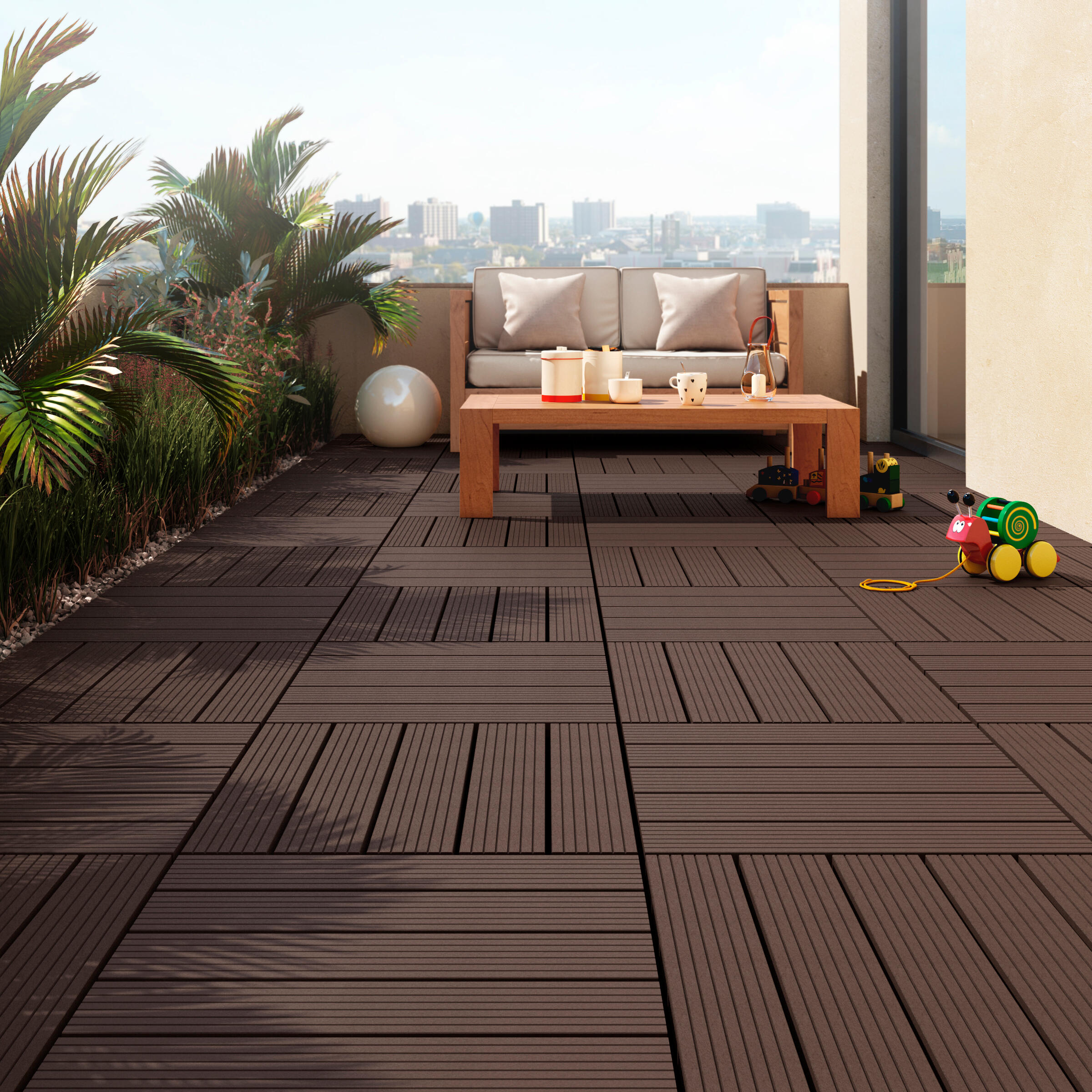 Baldosa para exterior con base plástica fabricada en composite con acabado ranurado en color marrón. Se deben montar sobre superficies con una ligera inclinación para facilitar el drenaje preferentemente sobre solera de cemento o baldosas, se unen entre sí con un sistema de base plástica machihembrada y se recomienda fijar las baldosas de los extremos y algunas interior para evitar el movimiento de las mismas. Medidas: 50 x 50 x 2,5 cm (ancho x largo x grosor).