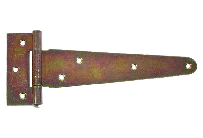 Bisagra en forma de T fabricada en acero bicromatado, indicada para colocar en puertas de entre 30 y 80 mm. Se fija mediante tornillos y soporta un peso máximo de 80 kg. Medidas: 100 x 75 mm (largo x ancho).