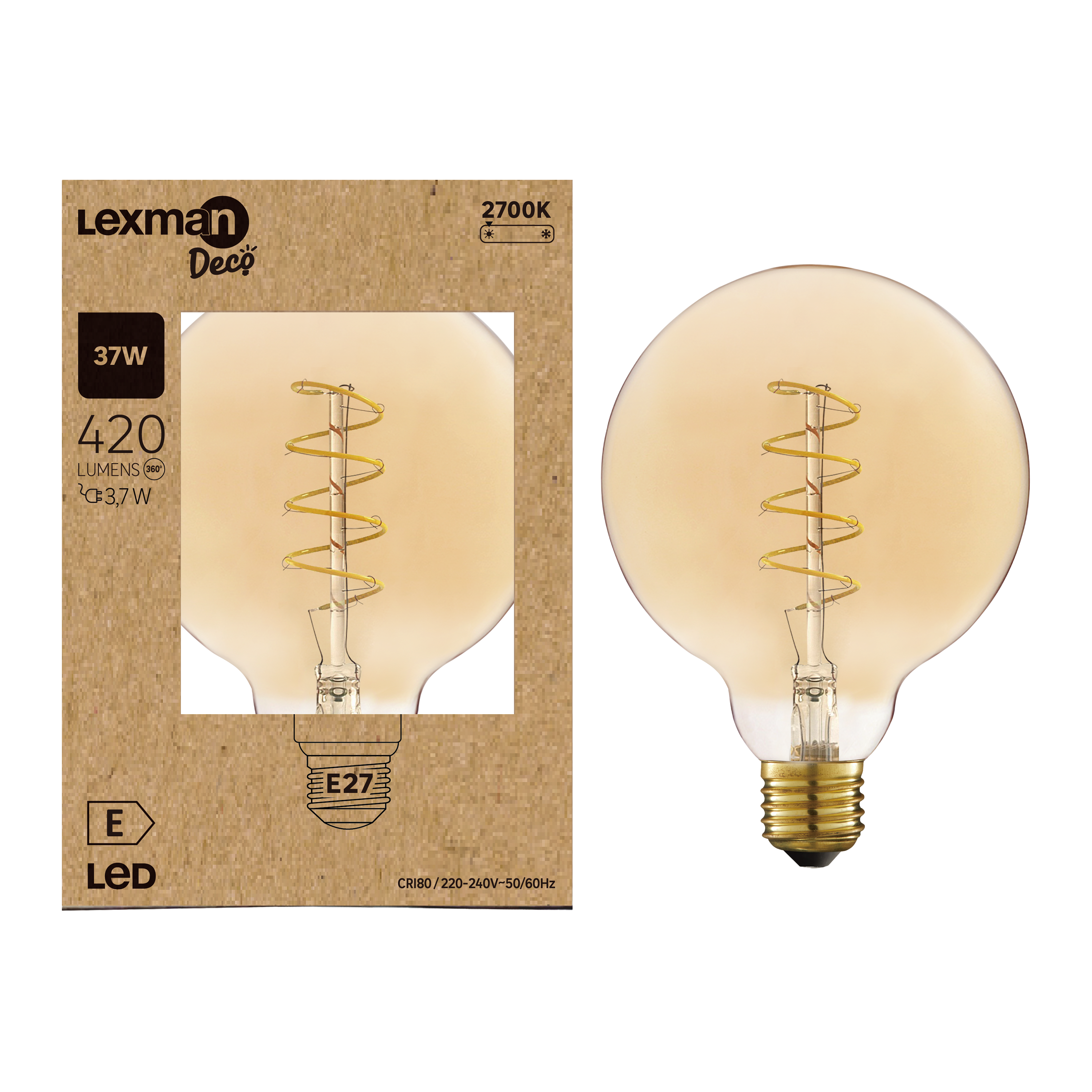 Bombilla Lexman fabricada en vidrio con tecnología led filamento y casquillo E27. Presenta un índice de protección IP20 (recomendado para espacios interiores en los que la iluminación no se vea expuesta a factores externos peligrosos), una temperatura de color de 2700 K, lo que se traduce en una luz de color blanco cálido, 420 lúmenes de intensidad luminosa, 3,7 W de potencia y 220-240 V de tensión. Vida útil: 25000 horas. Etiqueta energética: E. Ofrece 5 años de garantía.