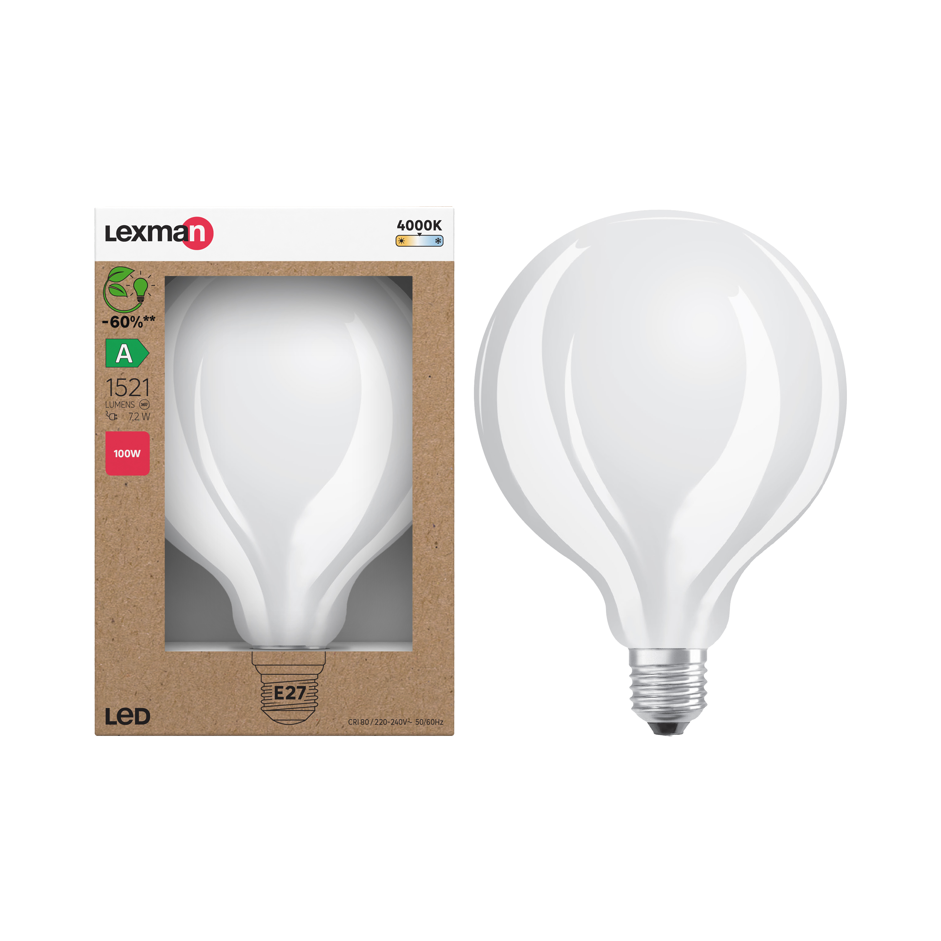 Bombilla Lexman fabricada en vidrio con acabado de color blanco y tecnología led filamento. Cuenta con 1521 lúmenes de flujo luminoso, 4000 K de temperatura de color, lo que se traduce en una luz de color blanco neutro, índice de protección IP20, casquillo E27, 7,2 W de potencia y 220-240 V de tensión. Ofrece 3 años de garantía.