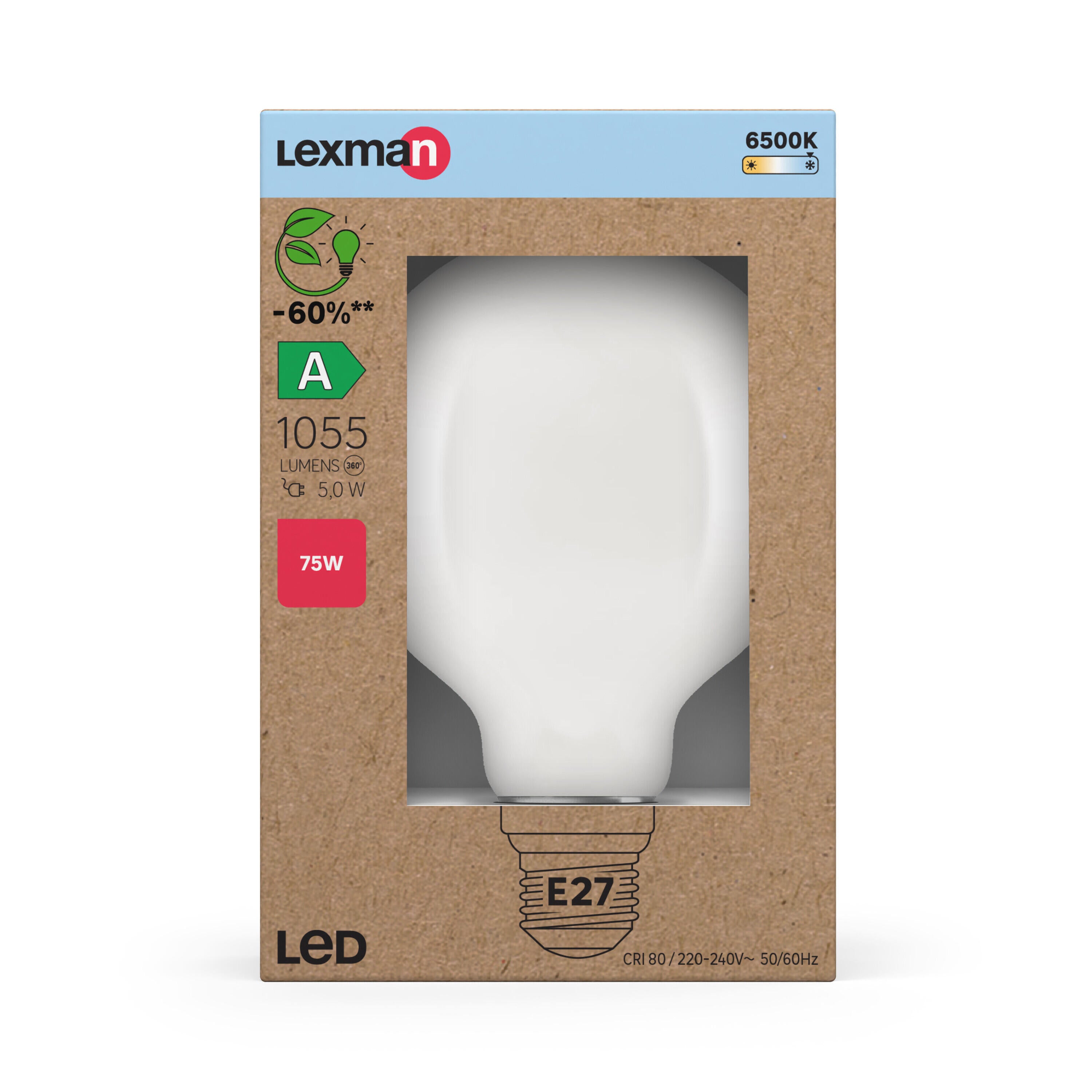 Bombilla Lexman fabricada en vidrio con acabado de color blanco y tecnología led filamento. Cuenta con 1055 lúmenes de flujo luminoso, 6500 K de temperatura de color, lo que se traduce en una luz de color blanco frío, índice de protección IP20, casquillo E27, 5 W de potencia y 220-240 V de tensión. Ofrece 3 años de garantía.
