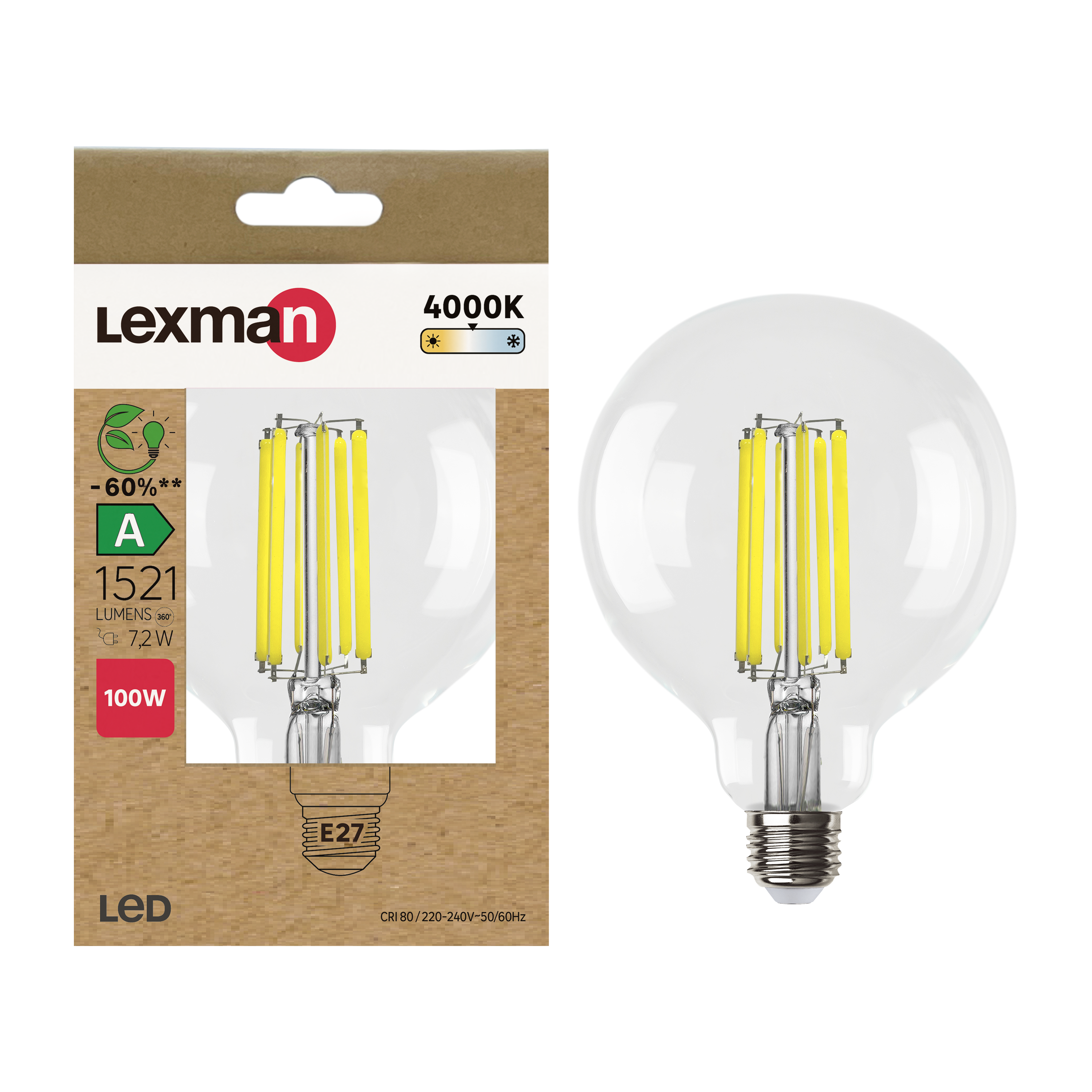 Bombilla Lexman fabricada en vidrio con tecnología led filamento y casquillo E27. Presenta un índice de protección IP20 (recomendado para espacios interiores en los que la iluminación no se vea expuesta a factores externos peligrosos), una temperatura de color de 4000 K, lo que se traduce en una luz de color blanco neutro, 1521 lúmenes de intensidad luminosa, 7,2 W de potencia y 220-240 V de tensión. Vida útil: 50000 horas. Etiqueta energética: A. Ofrece 5 años de garantía.