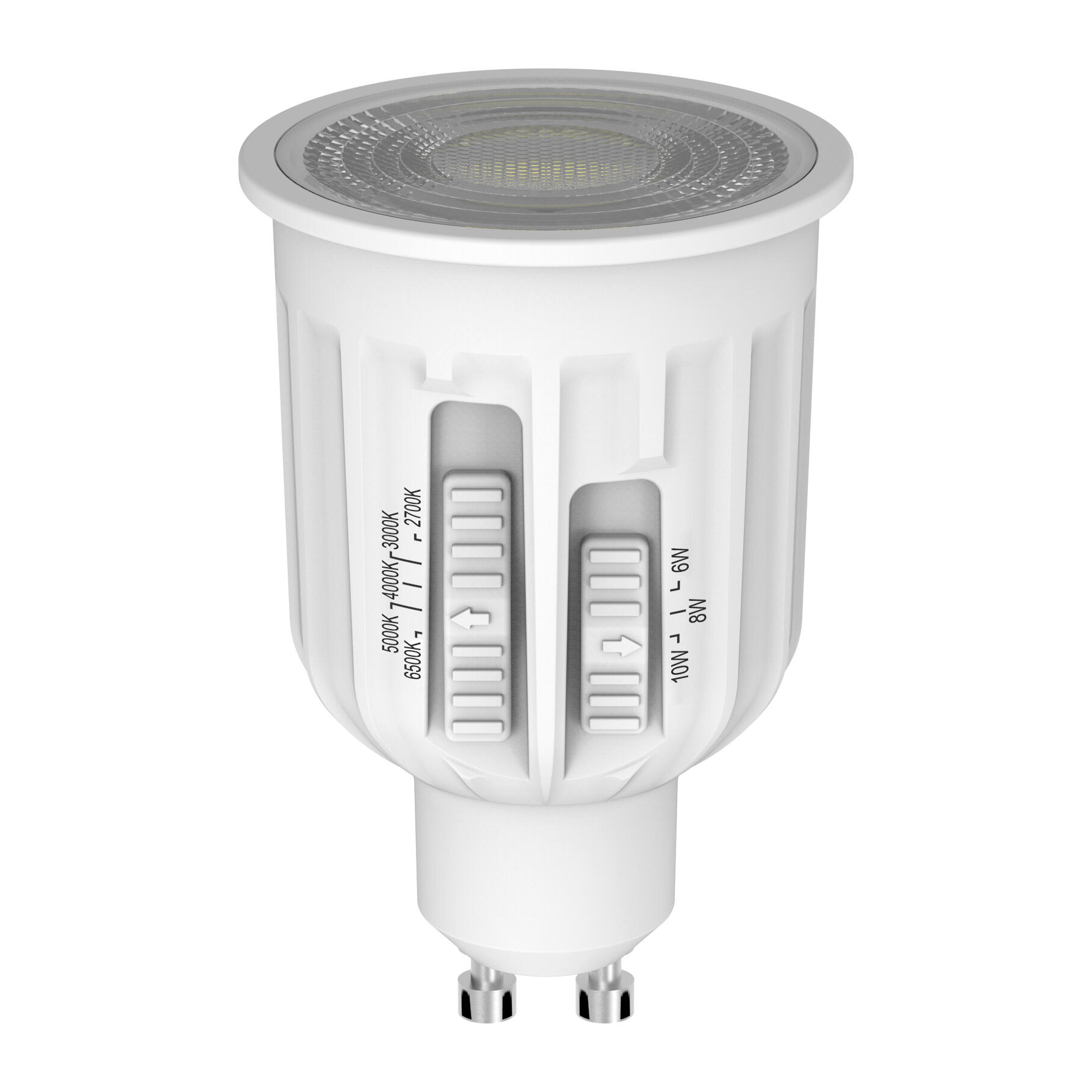 Lámpara dicroica LED GU10 con una potencia seleccionable de 6W, 8W o 10W y con un temperatura de color CCT con 5 opciones de ajustar el tono de luz: 2700K, 3000K, 4000K, 5000K o 6500K antes de su colocación, que mejor se adapte a su necesidad. Con un ángulo de apertura del haz de luz de 105º para iluminar superficies amplias y reducir sombras. Es de fácil instalación y tiene una vida útil de 15.000 horas, con un índice de protección IP20. La medidas son Ø49x55mm.