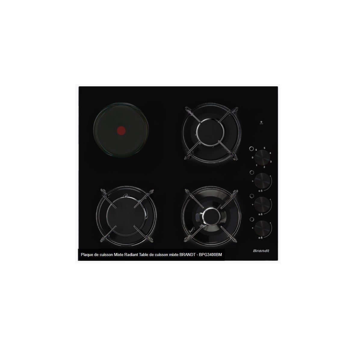 Brandt BPG3400BM Placa cristal gas 60 cm mixta de 3 gas, 1 Eléctrico, Potencia máx gas 5,7 kW Electrica 1,5 kW, Mando integrado, Seguridad termopar