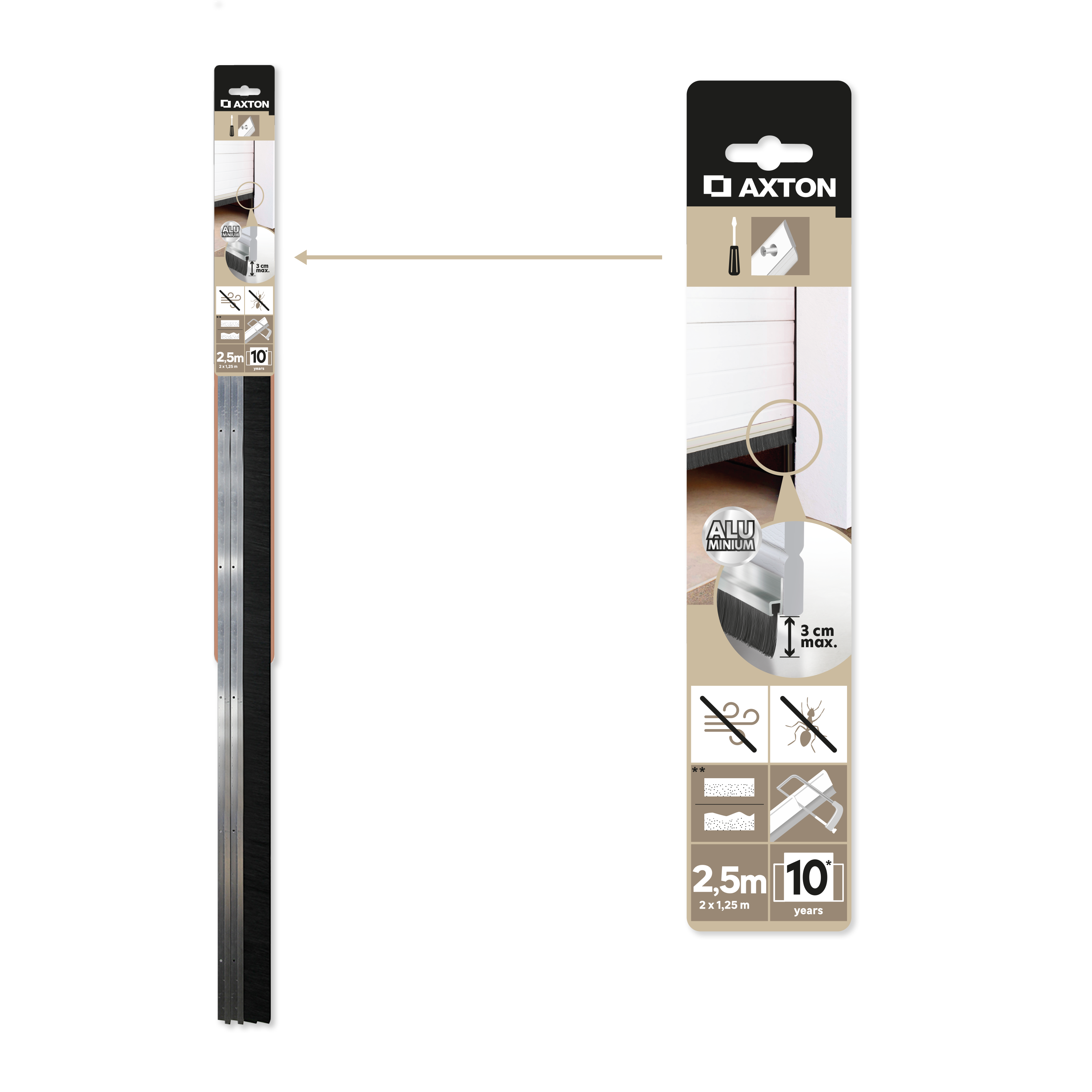 Bajo de puerta de aluminio Axton para colocar en la parte inferior de la puerta del garaje. El perfil de la junta es plano y presenta un tipo de junta en forma de cepillo negro. Uso apto para cualquier tipo de suelo. Aunque se comercializa en piezas con una longitud de 1,25 metros se puede recortar para ajustar en puertas de tamaño inferior. Su fijación es invisible y muy sencilla mediante el empleo de tornillos. Sirve como aislante térmico y acústico, protegiendo tus estancias de corrientes de aire y ciertos ruidos. Medidas: 1,25 m de largo.