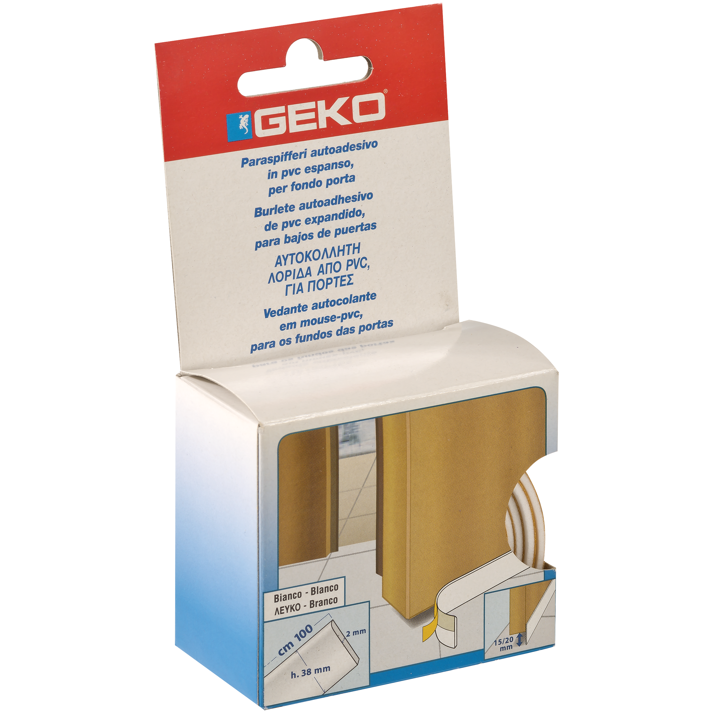 Burlete de puerta interior GEKO pvc adhesivo goma en color blanco, 5 mm de espesor x 3.8 cm de altura x 100 cm de longitud. Recortable. Tipo de instalación encolado.
