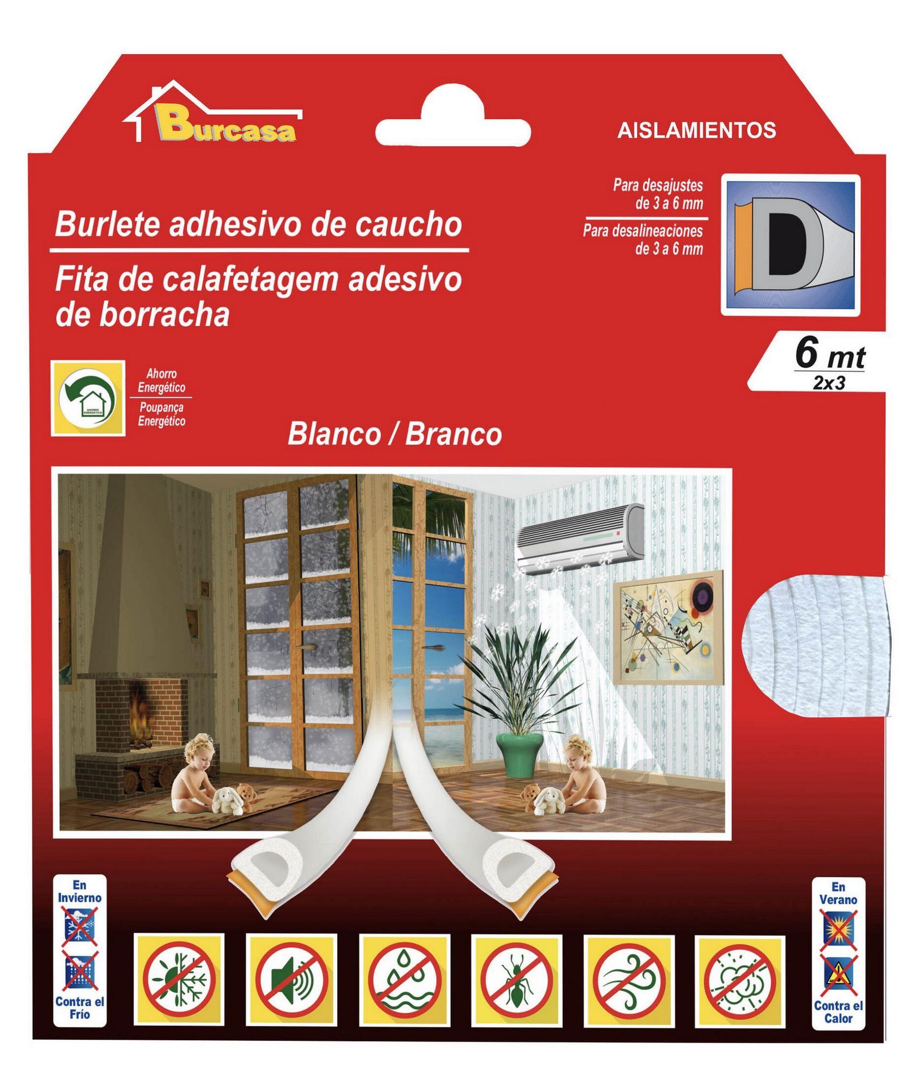 Burlete para ventanas y puertas BURCASA caucho en color blanco, 6 mm de anchura x 6 m de longitud. Impide el paso del agua. Perfil junta D. Recortable. Tipo de instalación encolado.
