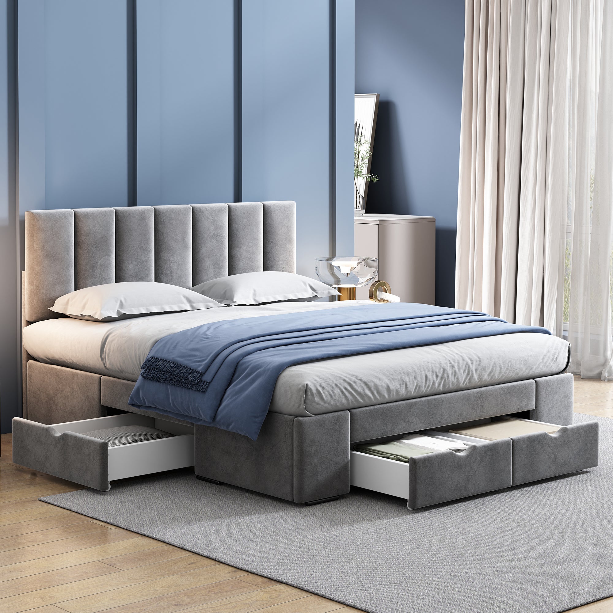 Cama con cabecero - 140 x 200 cm - 4 cajones - terciopelo - somier de láminas - color gris