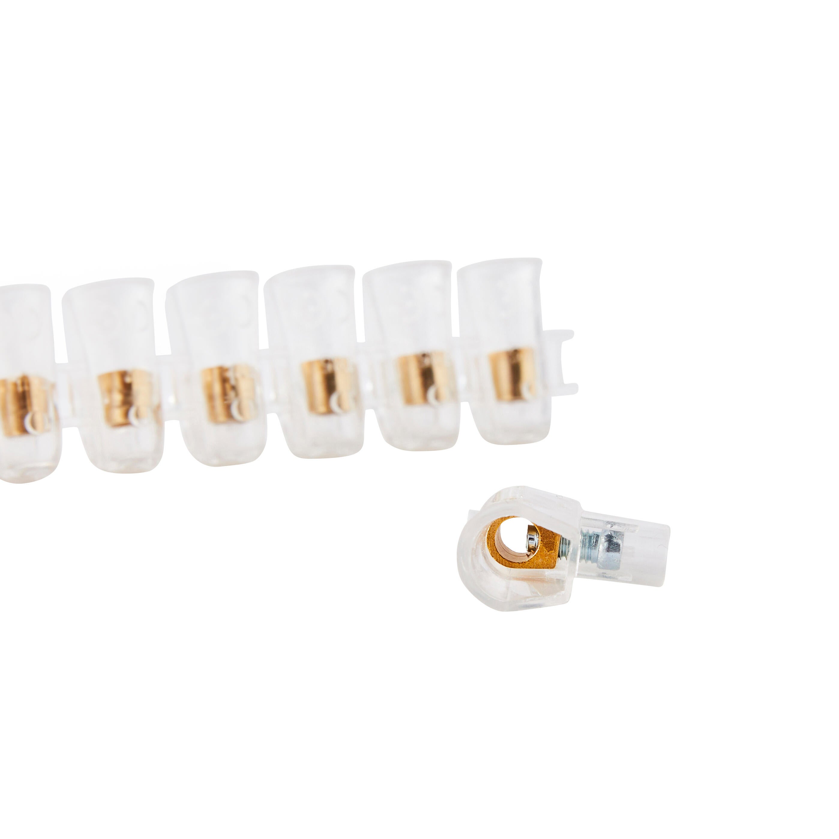 Regleta de terminales de tornillo transparente de un solo lado de LEXMAN ideal para conectar varios cables eléctricos. Esta gama de conectores Lexman es segura y práctica con una amplia selección de tamaños. Esta regleta se puede romper para ajustar el producto según el número de cables que se van a conectar. Incluso cuando se desatornilla por completo, los tornillos permanecen en su alojamiento, lo que garantiza un cableado cómodo. Sección transversal máxima de cables sólidos y trenzados 4 mm²