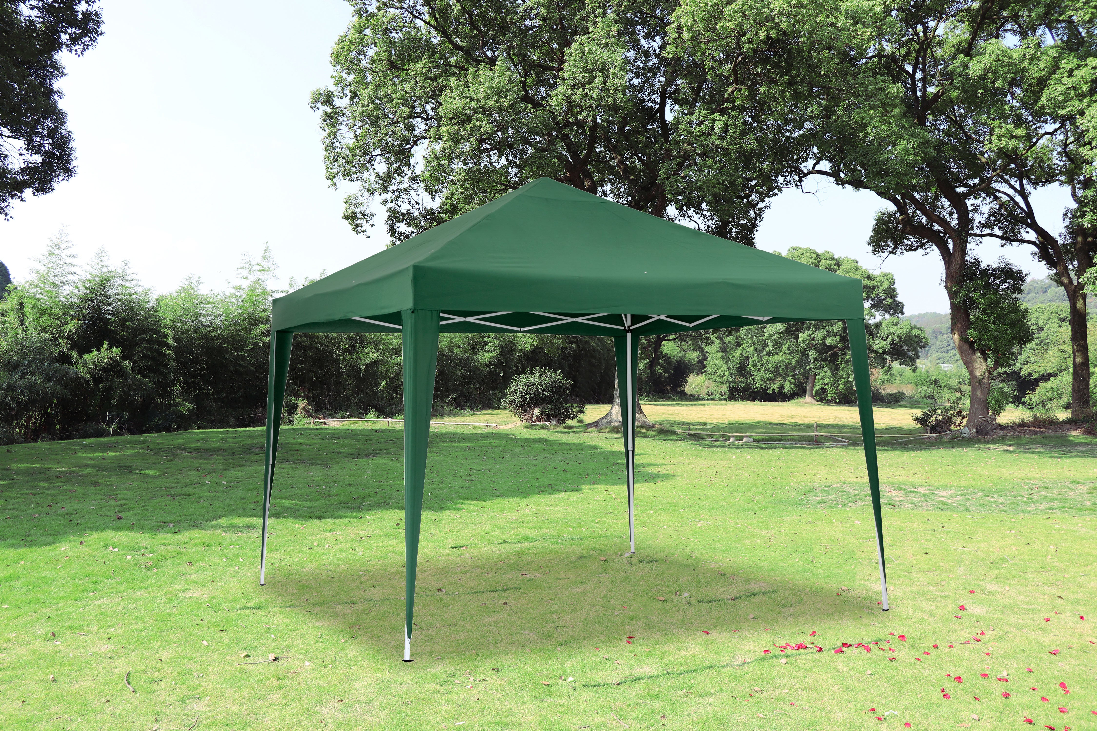 Carpa plegable con estructura en acero y toldo de poliéster de color verde. Muy fácil de montar y transportar. Incluye piquetas y cuerdas para su sujección. Entrega a pie de vehículo. Medidas: 300x260x300 cm (ancho/alto/longitud).