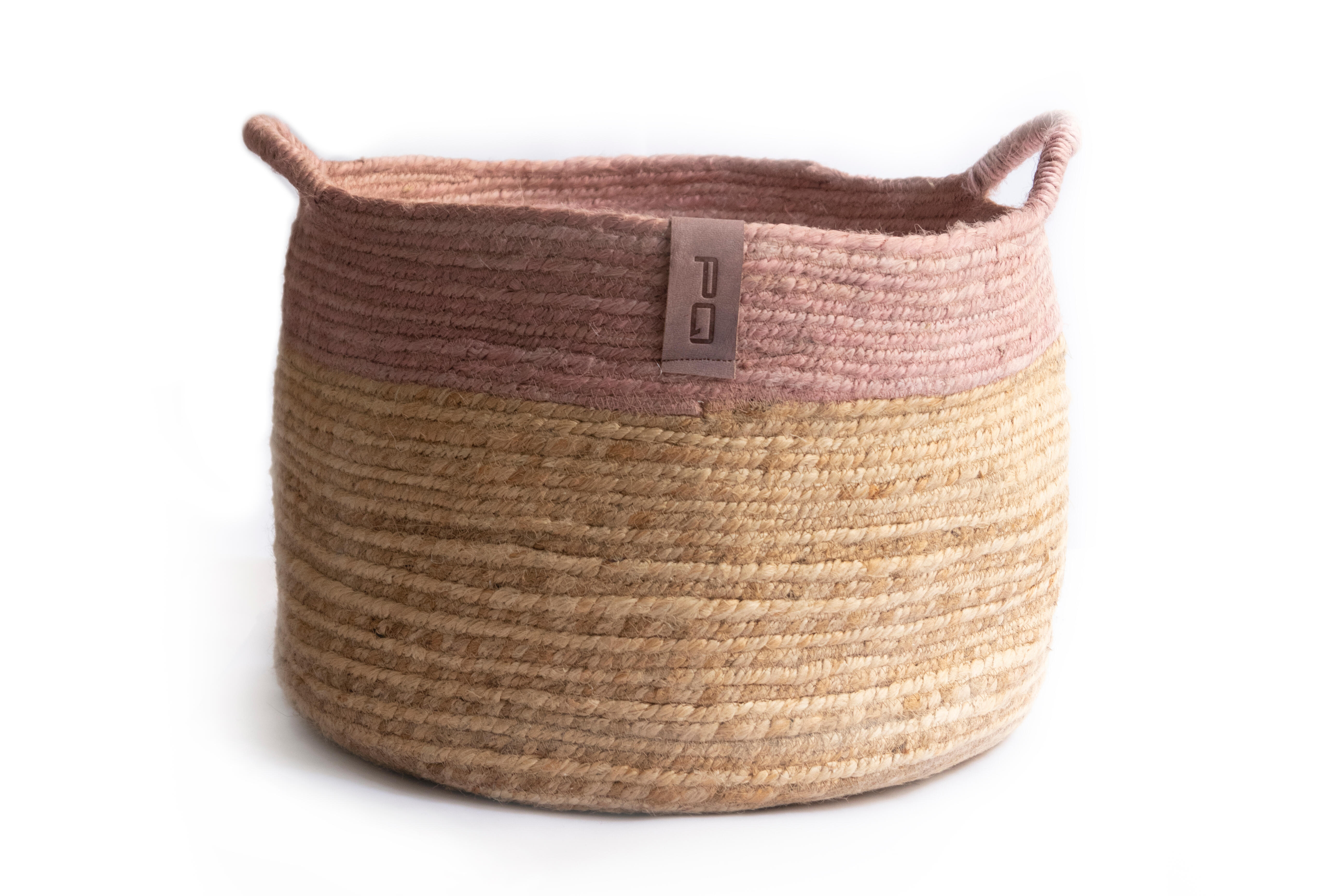 Cesta de yute trenzado bicolor rosa, 37x30 cm. Destaca por su acabado artesanal y su tamaño amplio, aportando un toque cálido y rústico a cualquier espacio.