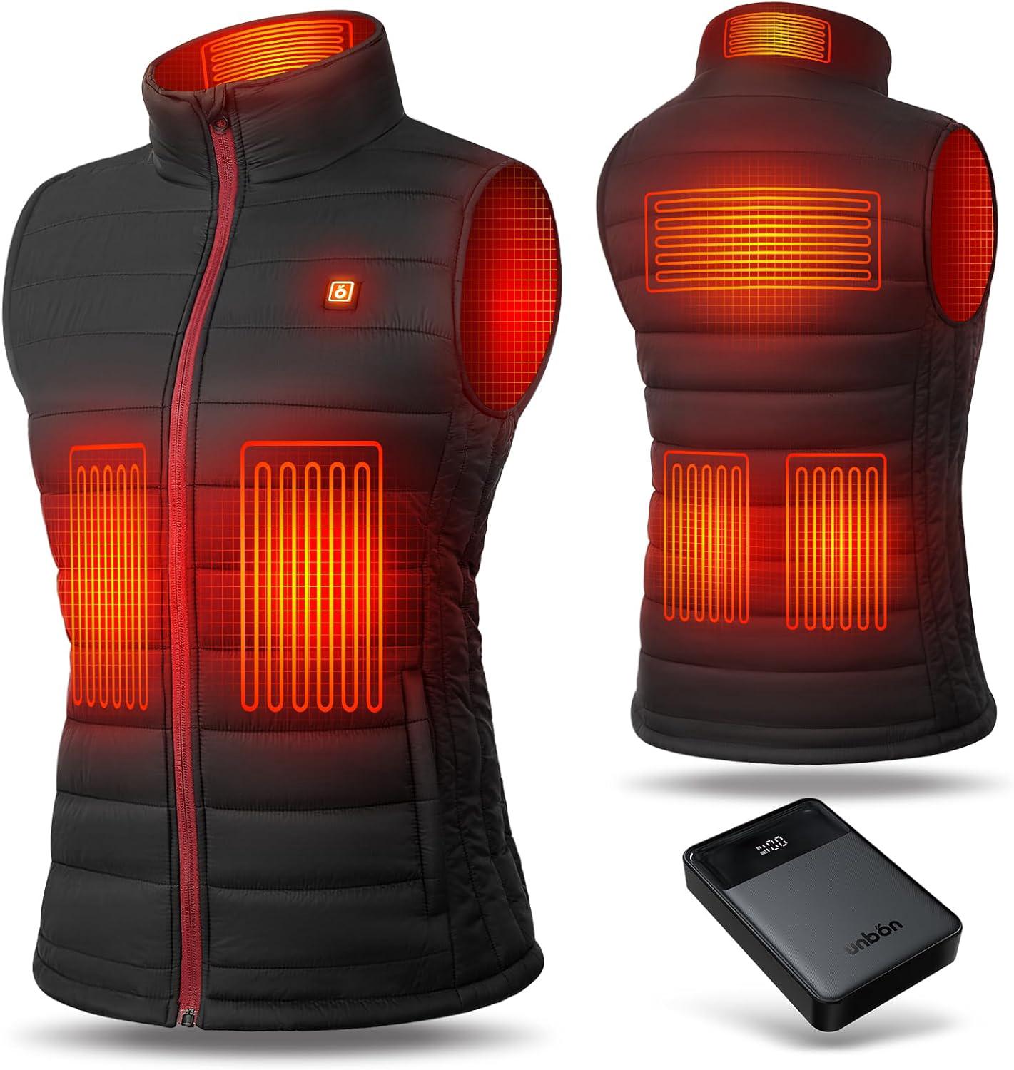 【Batería de 14400 mAh incluida】¡NUEVO 2023! El chaleco calefactable UNBON para mujer incluye una potente batería que te permite disfrutar de hasta 10 horas de autonomía en bajas temperaturas. Este chaleco cuenta con una batería ligera y compacta que no resulta voluminosa y se guarda fácilmente en el bolsillo interior con cremallera. Equipada con un puerto de entrada/salida USB-C y un puerto de salida USB-A (hasta 22,5 W), la batería también puede usarse como batería externa para cargar rápidamente tus teléfonos u otros dispositivos. 【4 Zonas de Calefacción】Este chaleco calefactable eléctrico para mujer incorpora tecnología de calefacción por fibra de carbono que permite una rápida distribución del calor en segundos. Con cuatro zonas de calefacción estratégicamente ubicadas en la espalda, el cuello y ambos lados del abdomen, este chaleco proporciona una calidez óptima con una excelente distribución del calor en la parte superior del cuerpo. [3 Niveles de Calefacción] Este chaleco calefactable para mujer, con batería incluida, ofrece tres modos de calefacción: alta temperatura (65 °C, rojo), media (55 °C, blanco) y baja temperatura (45 °C, azul). Selecciona la temperatura perfecta con solo pulsar un botón. El chaleco te mantiene abrigada y te permite moverte con total libertad; no es necesario usar capas de ropa en climas fríos. [Diseño Elegante y Cómodo] Este chaleco calefactable con batería incluida está confeccionado en poliéster 100% ultraligero, lo que lo hace suave y cómodo. Confeccionado con un tejido exterior resistente al viento y al agua, y un forro interior suave y transpirable, este chaleco ligero con batería y cremallera suave bloquea eficazmente el frío y retiene el calor, proporcionando una agradable sensación de calidez incluso en temperaturas bajo cero. [Regalar] Este chaleco calefactable mujer con batería incluida te permite mantenerte abrigada durante largos periodos al aire libre y disfrutar de diversas actividades en días fríos, como motociclismo, caza, senderismo, esquí, acampada, pesca o pasear al perro. También es eficaz favorecer la circulación sanguínea y aliviar los dolores musculares. Un regalo , presentado en un elegante envase, especialmente aquellas sensibles al frío o que trabajan al aire libre en invierno.