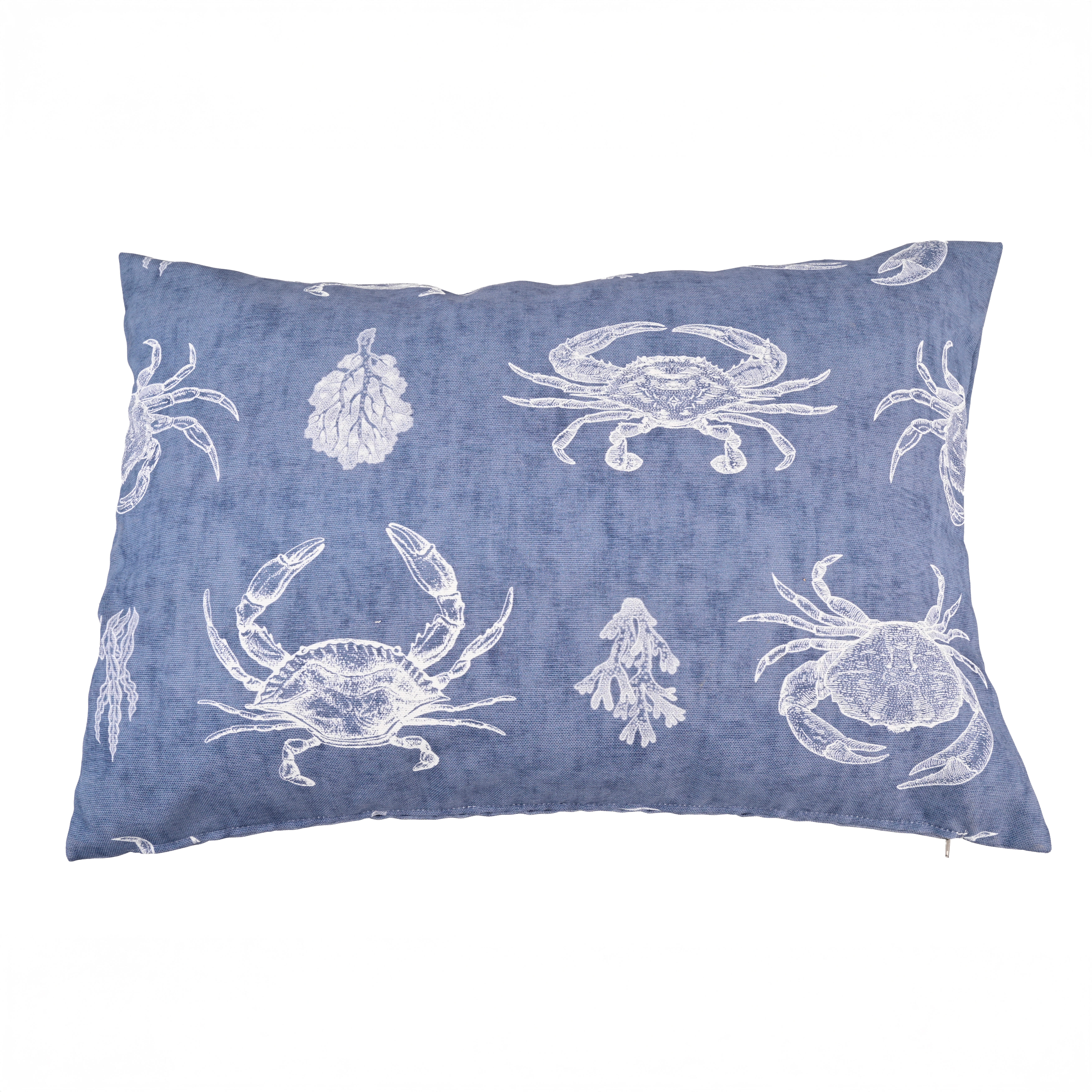 Cojín decorativo Sperone en azul, especialmente diseñado para uso decorativo en ambientes exteriores e interiores. Presenta un patrón de cangrejos y corales dibujados con trazos orgánicos en líneas blancas sobre un fondo azul. El patrón, cuidadosamente elaborado, evoca un estilo fresco y natural inspirado en el océano, ideal para dar un toque costero a cualquier ambiente. Perfecta para decorar terrazas, jardines o cualquier espacio de la casa. Incluye relleno, es desenfundable y posee cierre de cremallera para facilitar la limpieza. Medidas: 40x60 cm. Composición: 100% poliéster.