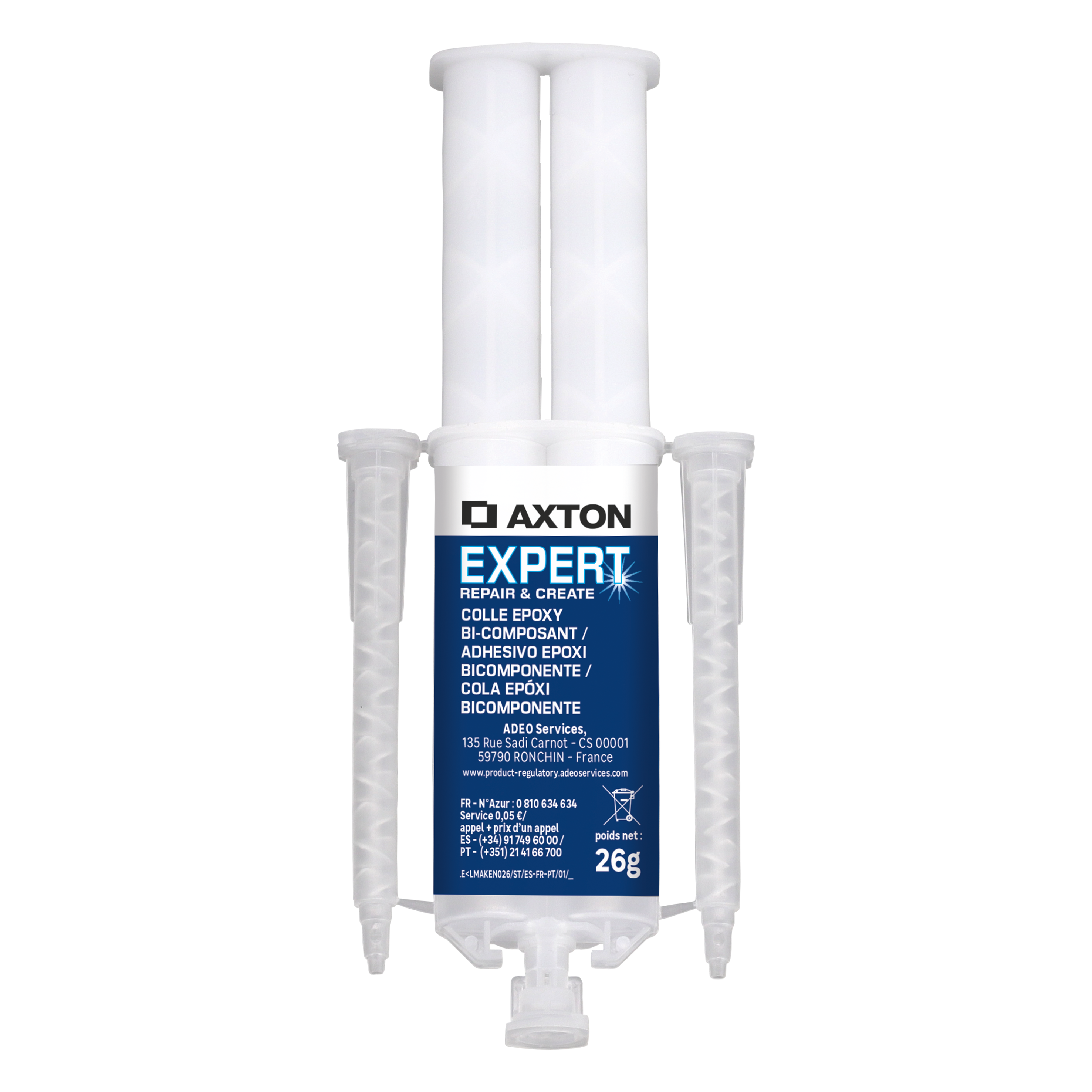 Adhesivo epoxi Axton fabricado en epoxi. Se aplica sin herramienta y necesita 24 horas de secado. Basta con disolventes para limpiarlo. Producto fabricado en la Unión Europea con 3 años de garantía. Contenido: 26 gramos.