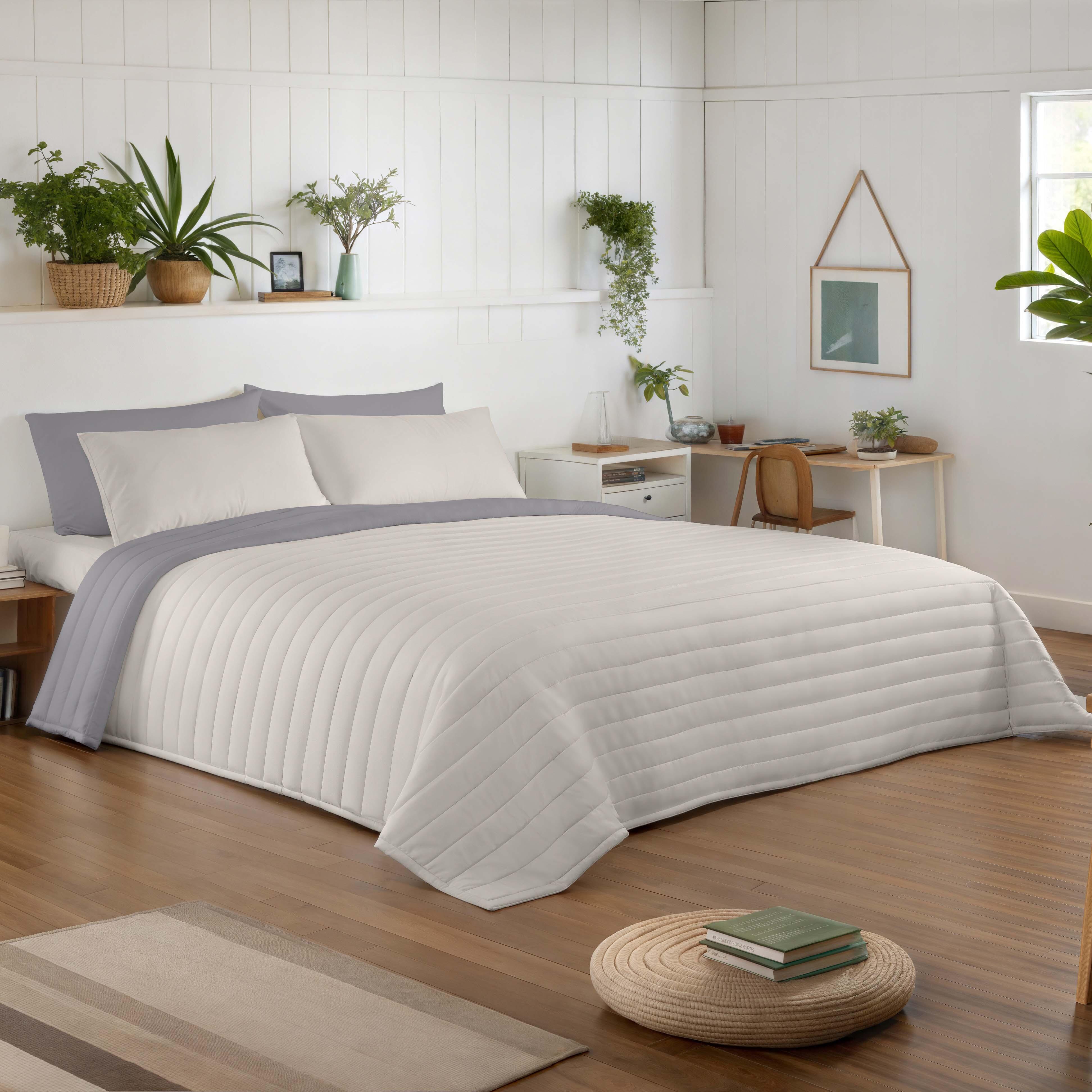 Colcha de cama fabricada en 100% microfibra de poliéster de gran calidad que posee gran suavidad y solidez en sus colores. Relleno de 70 gramos. Para camas de 90 cm. Medidas : 180x270 cm (ancho/longitud). Certificado OEKO-TEX, producto libre de sustancias nocivas y elementos peligrosos. Fabricado en España.
