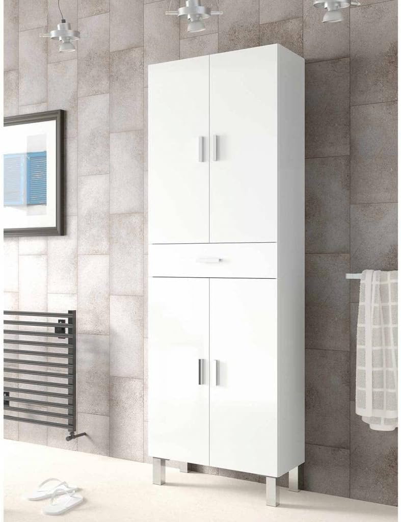 Columna Baño 4 puertas y Cajón, Color Blanco Brillo