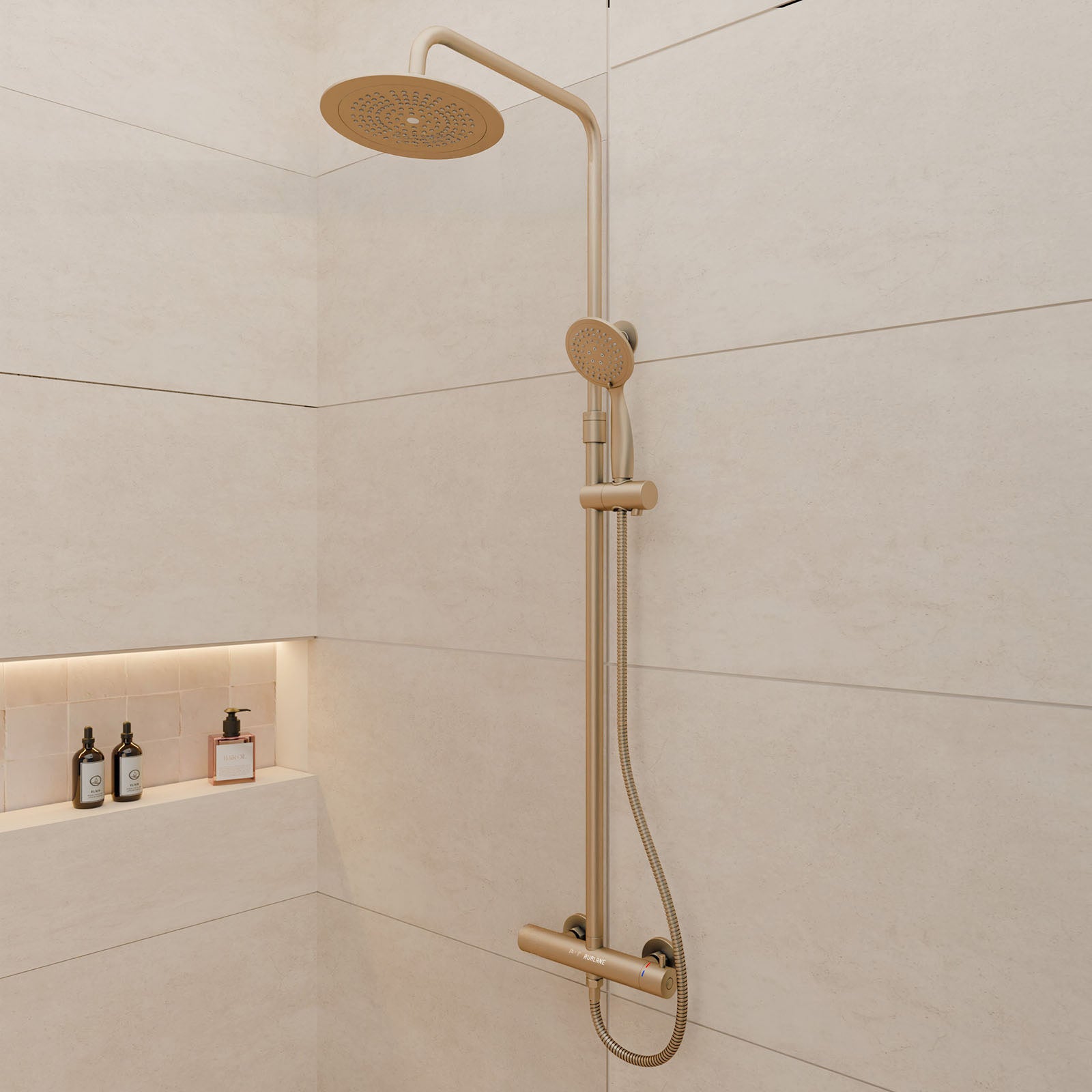 La columna de ducha en acabado oro cepillado con sistema mecánico es el toque perfecto para un cuarto de baño elegante y sofisticado.