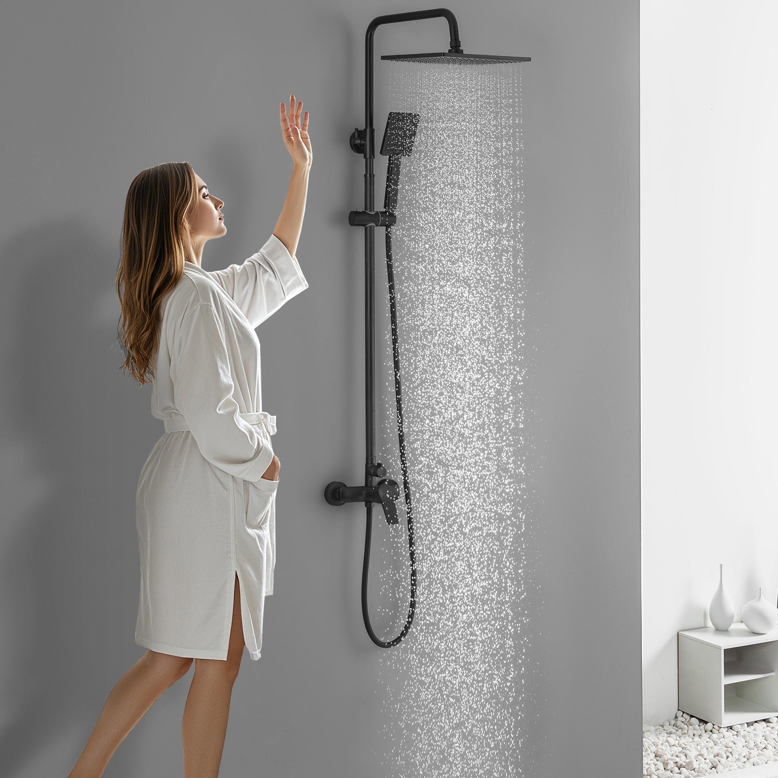 Más información Este enlace se abrirá en una nueva ventanaColumna de ducha negra con interruptor de manija, juego de ducha con cabezal de ducha de 25,4 x 25,4 cm y ducha de mano,diseño cuadrado baño