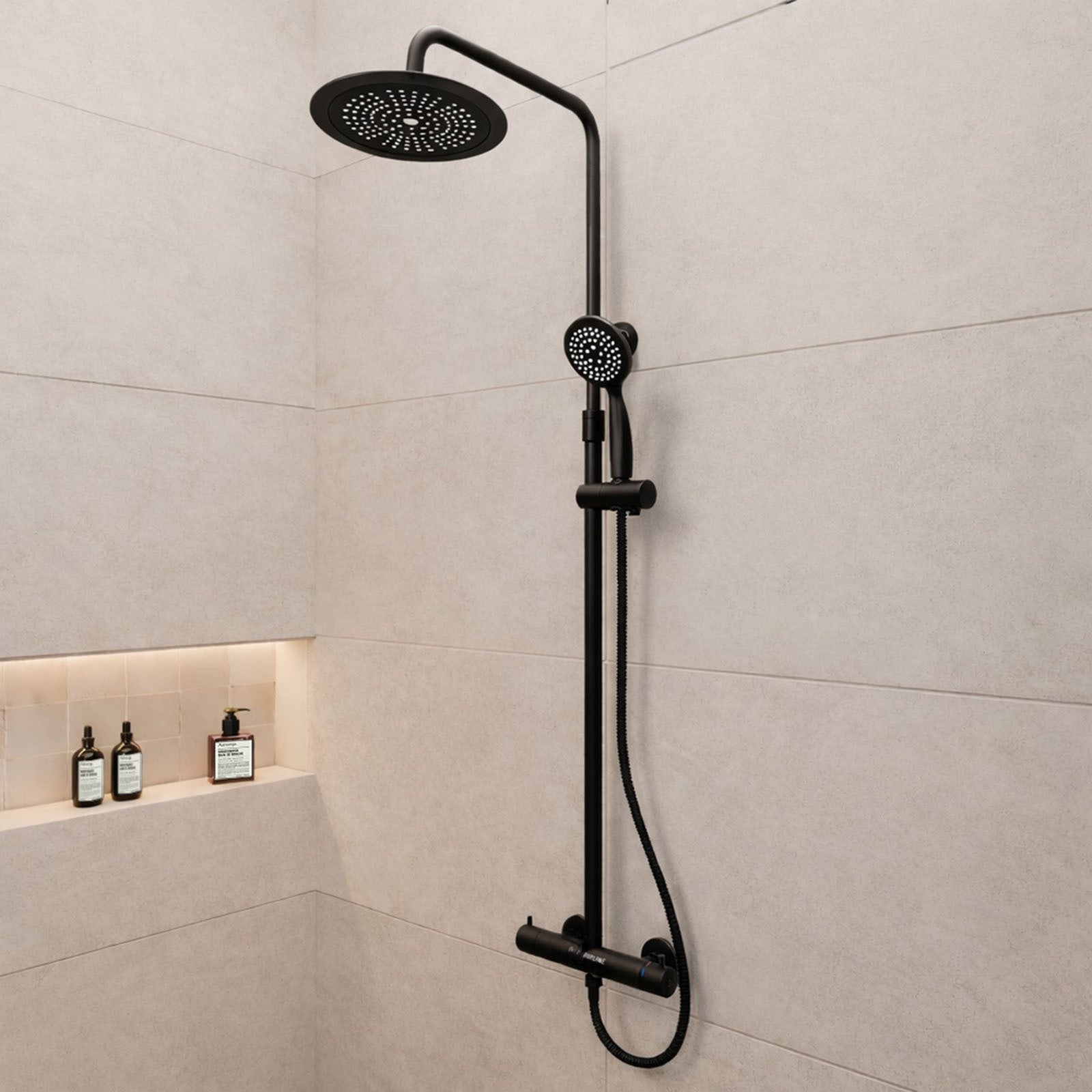 La columna de ducha en acabado negro mate con sistema termostático es el toque perfecto para un cuarto de baño elegante y sofisticado.